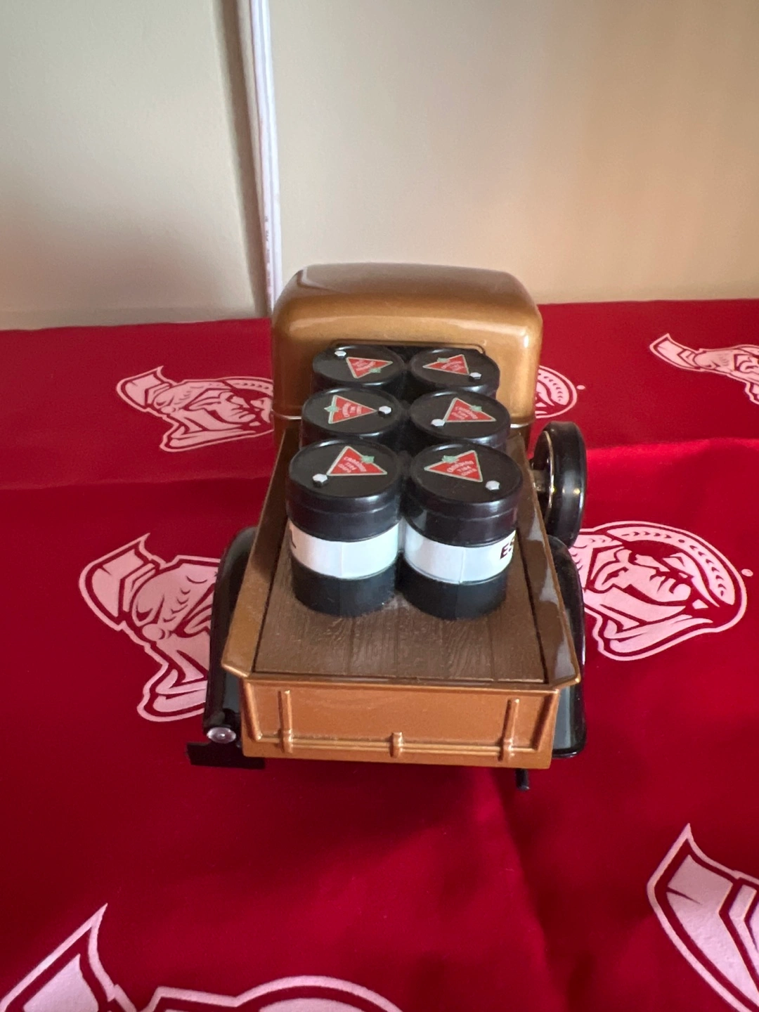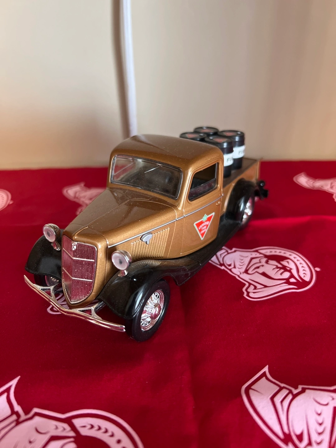 Collectible diecast model of a vintage truck. Features Canadian Tire Corp logo. Brown and black. Barrels in the truck bed. Looks like a 1930s Ford.