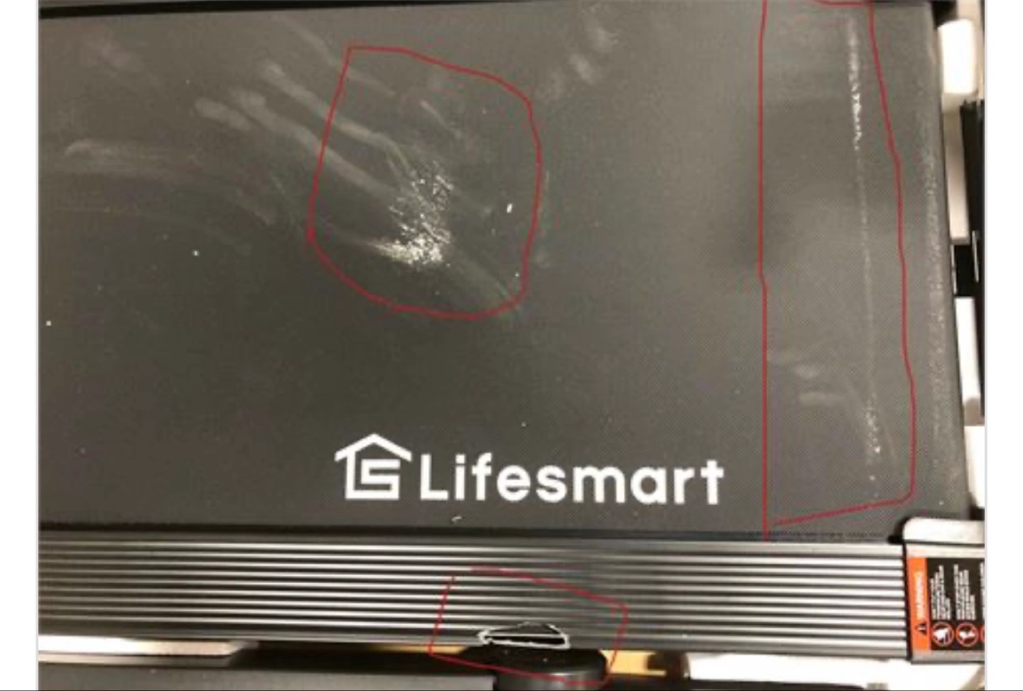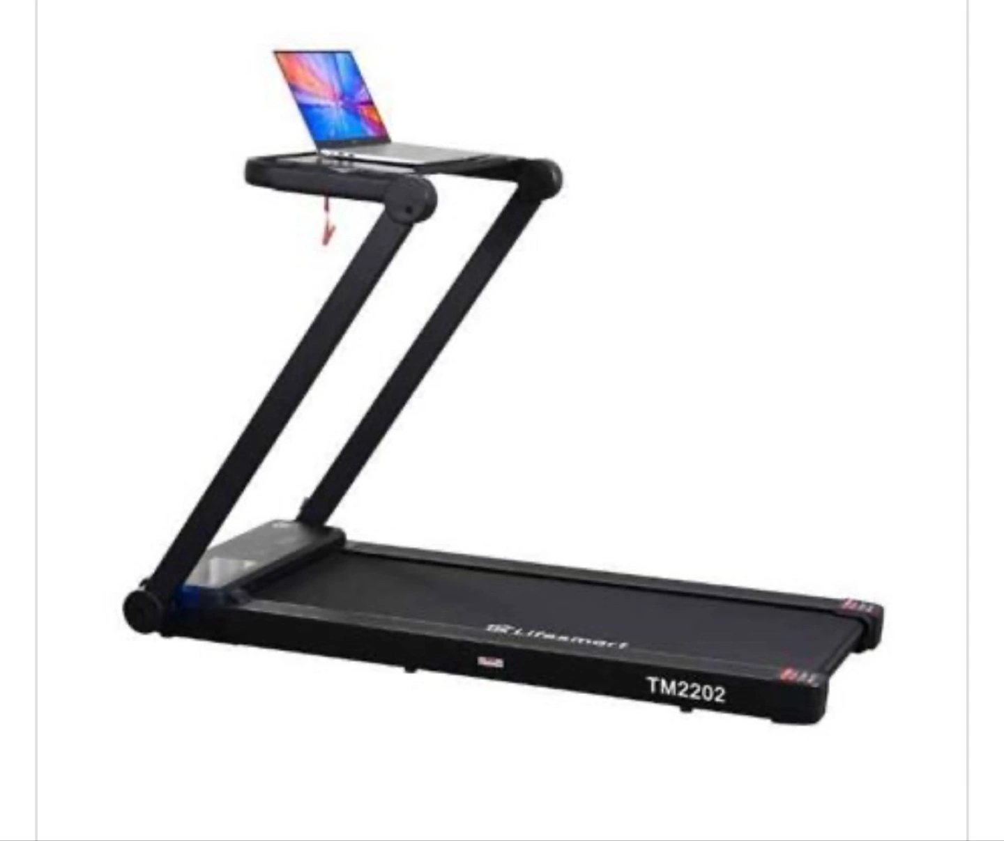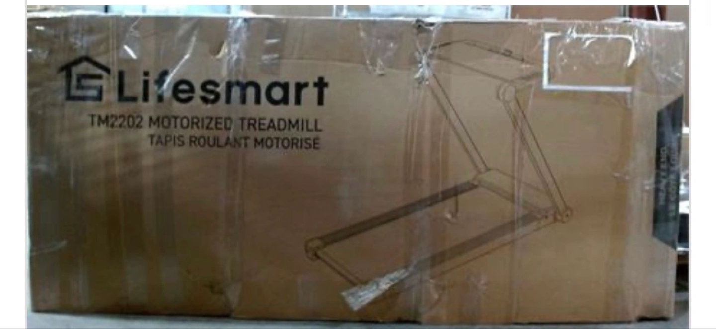 Brand new Lifesmart TM2202 motorized treadmill. Still in original box. Minor cosmetic damage to the treadmill belt and frame, see image. Features a built-in laptop stand. Compact and foldable design.