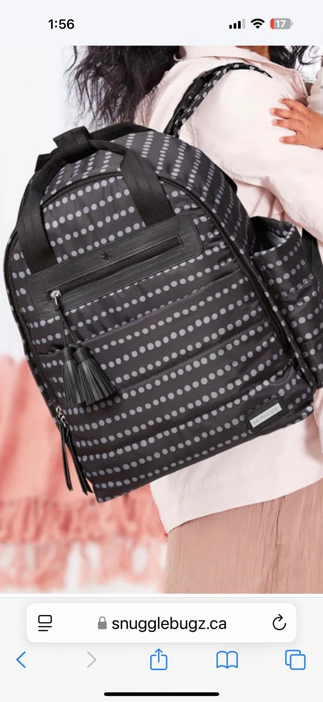 Stylish diaper backpack. Black with grey polka dots. Multiple pockets and compartments. Adjustable straps. Great for travel and everyday use. Washable, some invisible imperfections at the bottom of the bag seen on the last photo