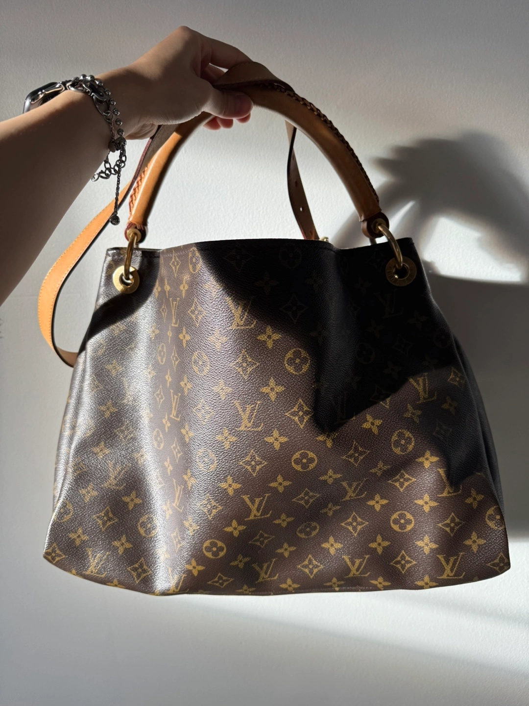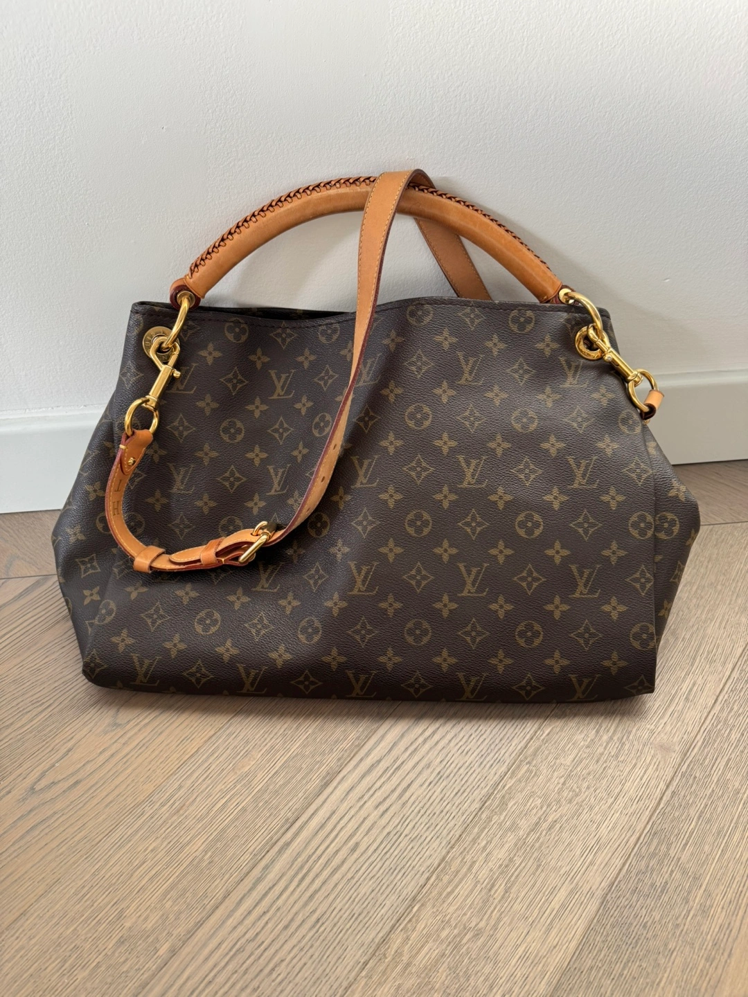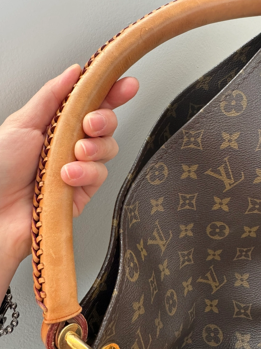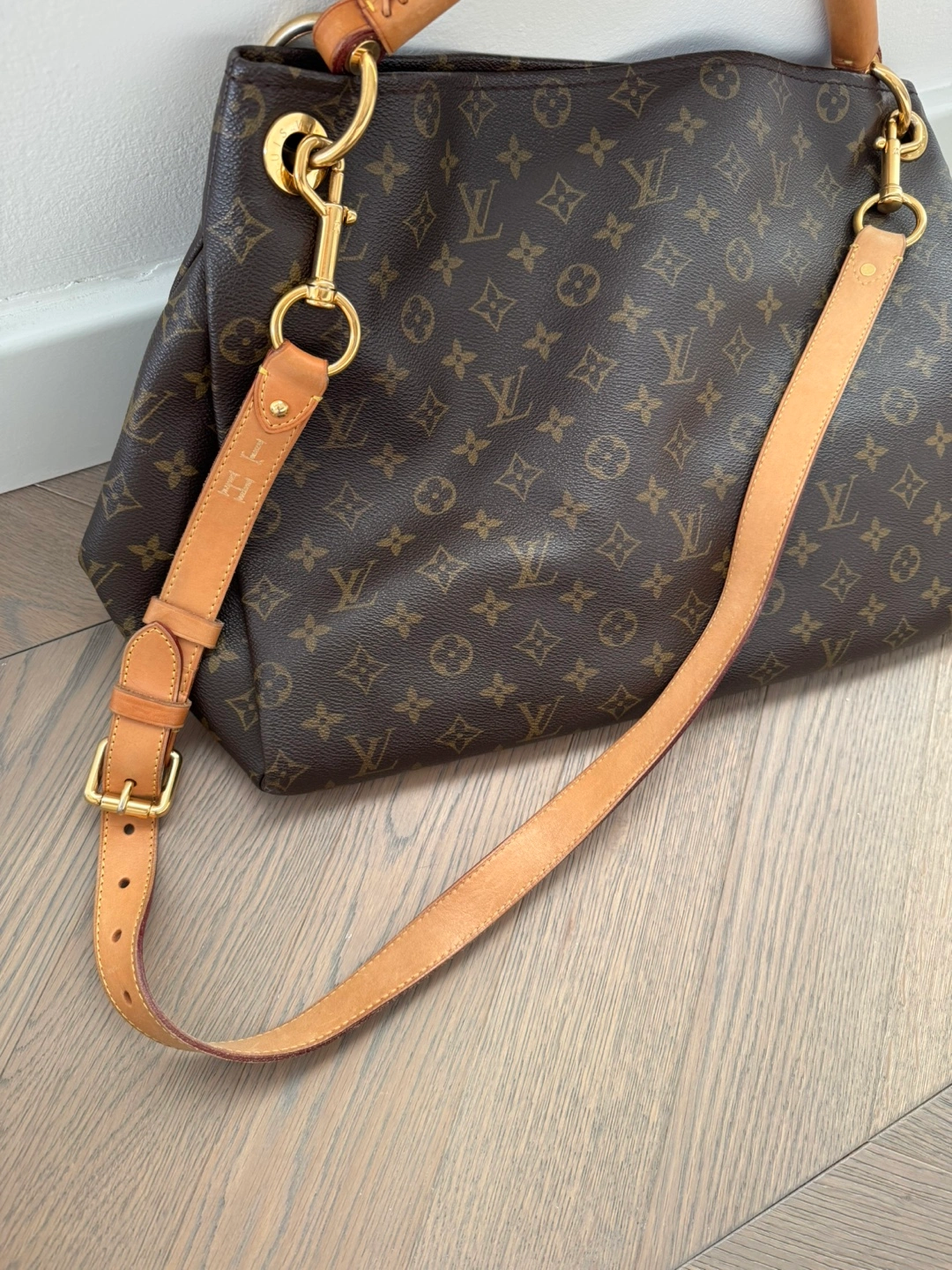 10Authentic LV Artsy Monogram shoulder bag/tote with strap. This model is discontinued. Leather handles and shoulder strap. Gold-tone hardware. Spacious interior. In great pre-owned condition. Strap has engraved initials HT. Stray is removable. Pre-owned stores and online platforms usually sell for 1800-2800 for this bag.