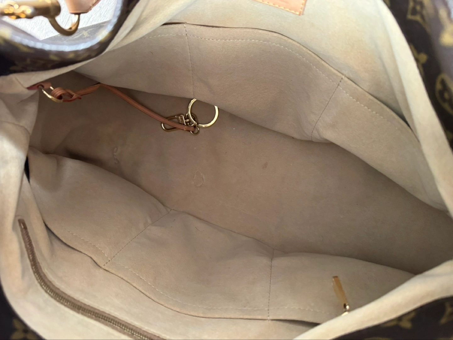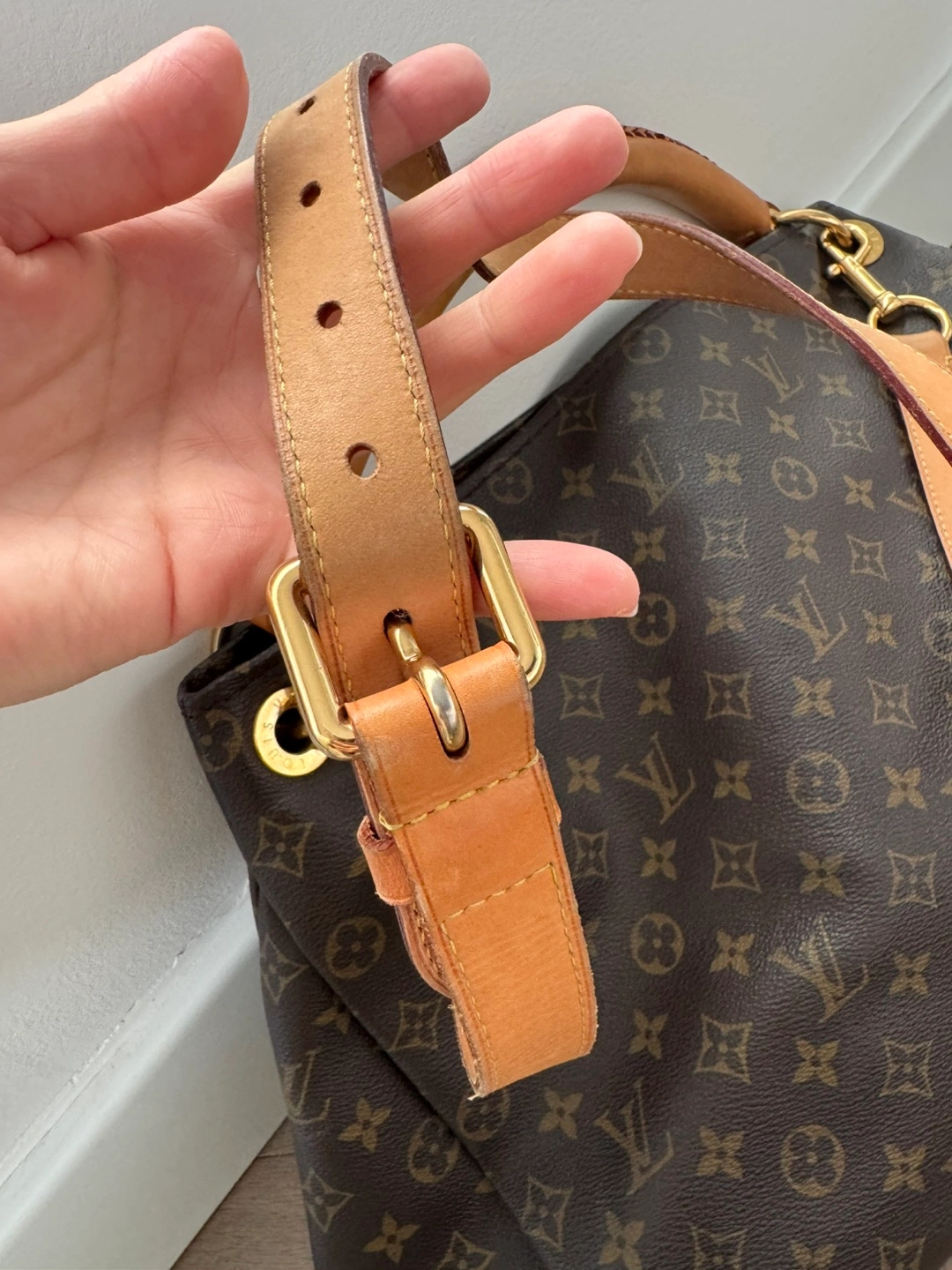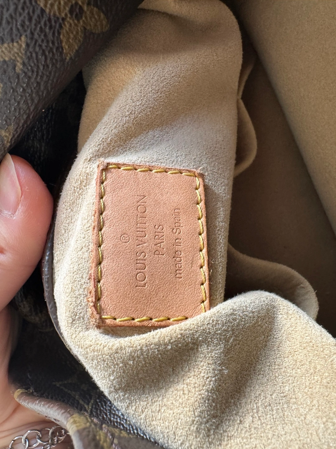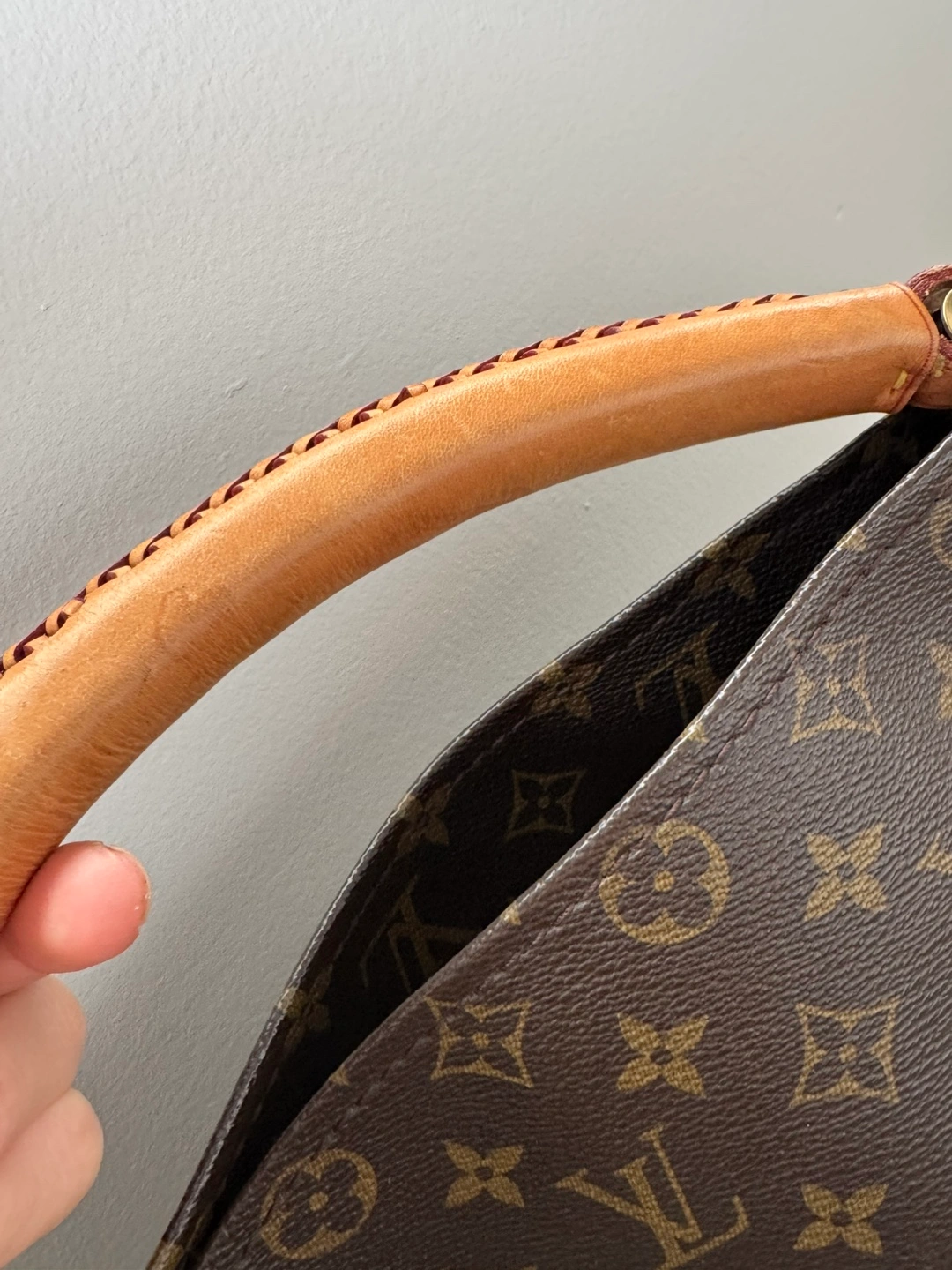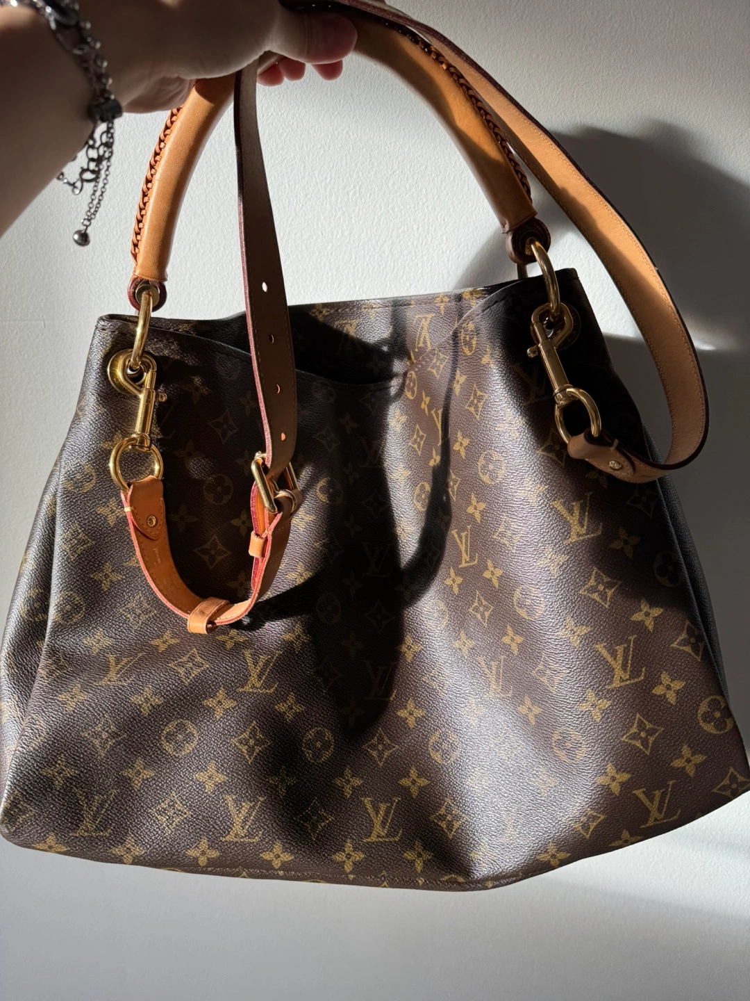10Authentic LV Artsy Monogram shoulder bag/tote with strap. This model is discontinued. Leather handles and shoulder strap. Gold-tone hardware. Spacious interior. In great pre-owned condition. Strap has engraved initials HT. Stray is removable. Pre-owned stores and online platforms usually sell for 1800-2800 for this bag.