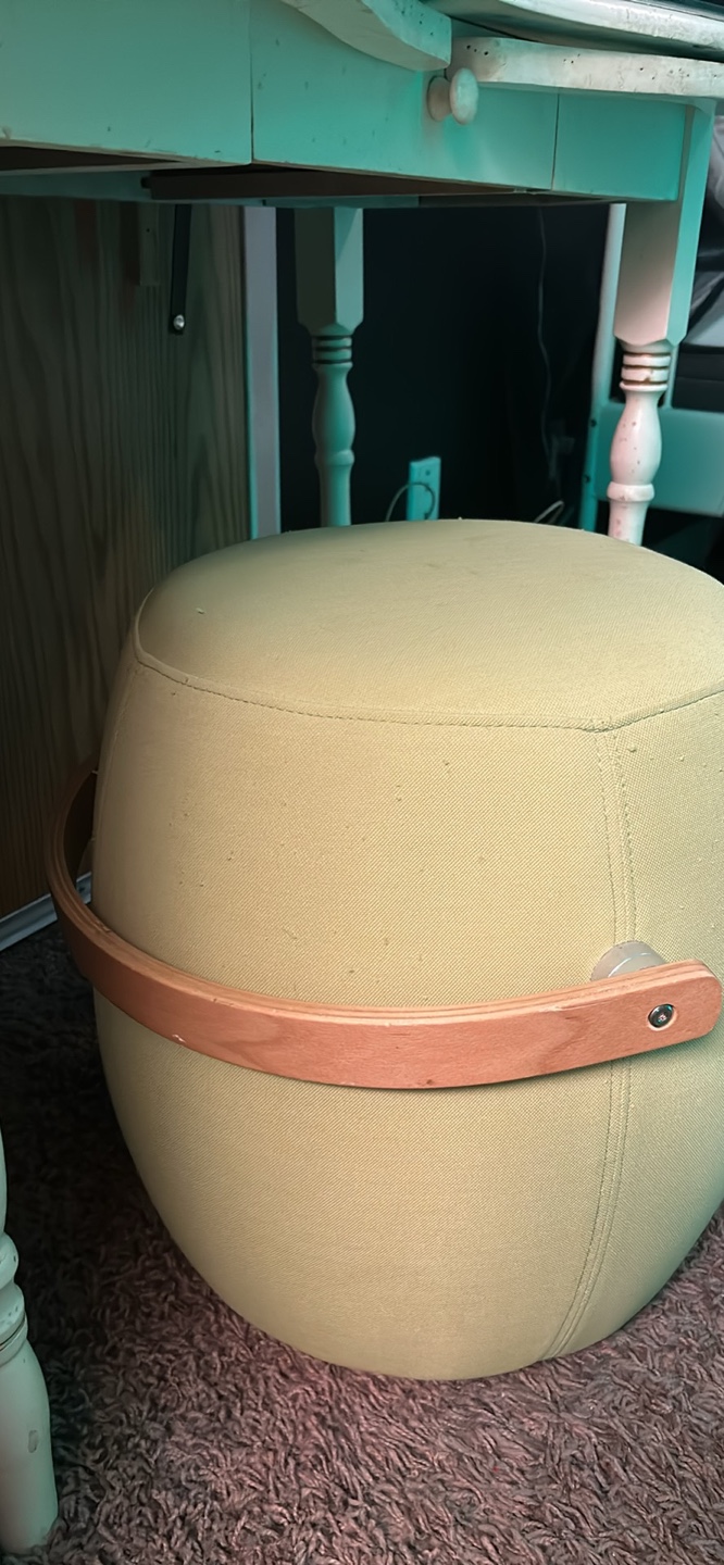 Round ottoman, light green fabric. Features a convenient wooden carrying handle. Good for extra seating or as a footrest.