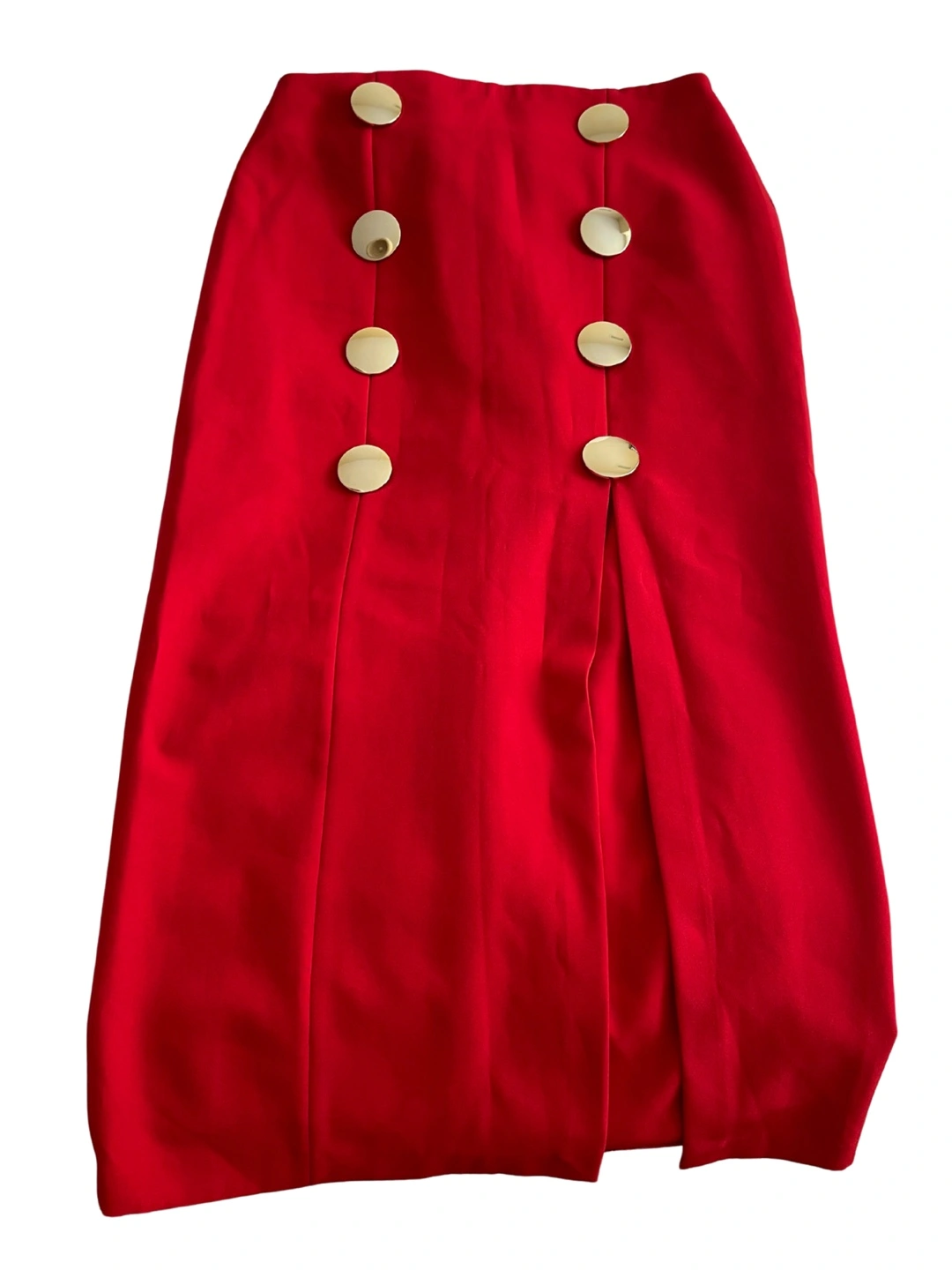 Stunning red midi skirt. Features gold buttons and a front slit. Size small. Made in Morocco.
