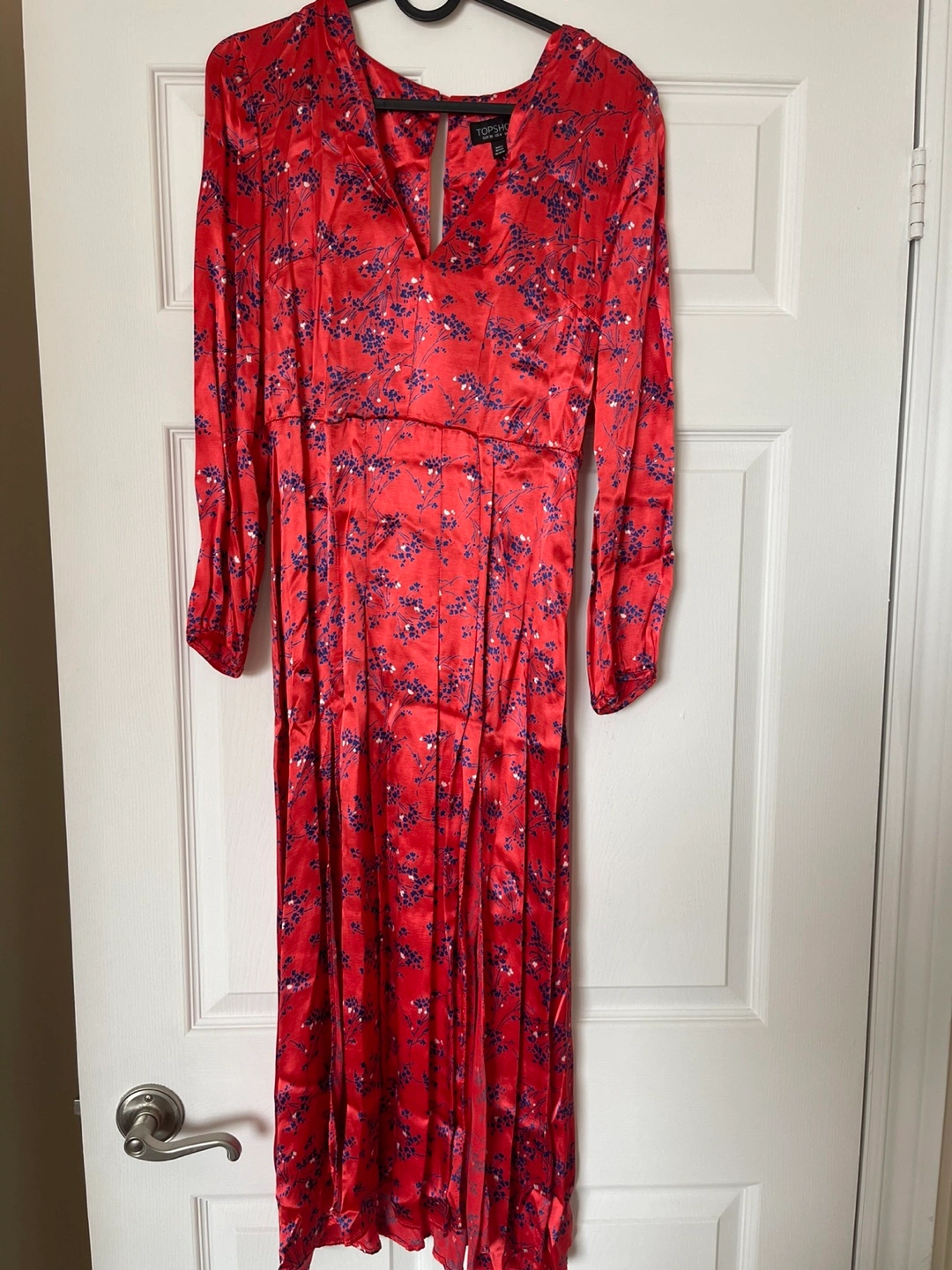Stunning red midi dress. Features long sleeves, V-neckline, and side slits. Floral print. Excellent condition. Fits small