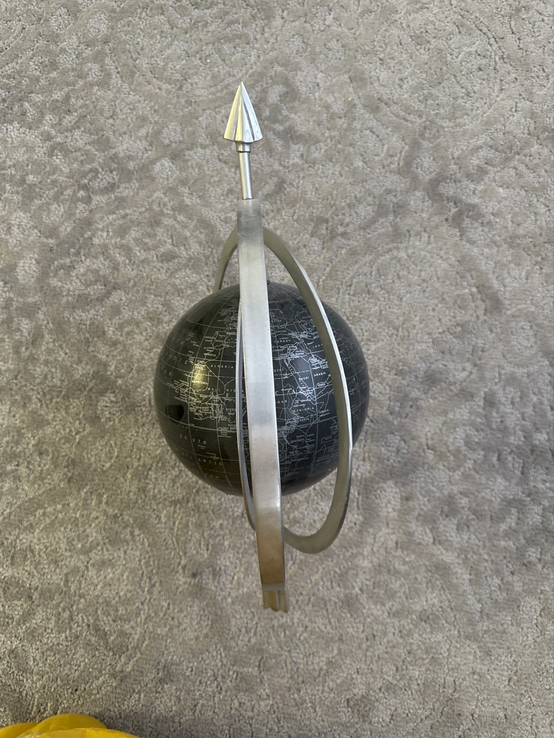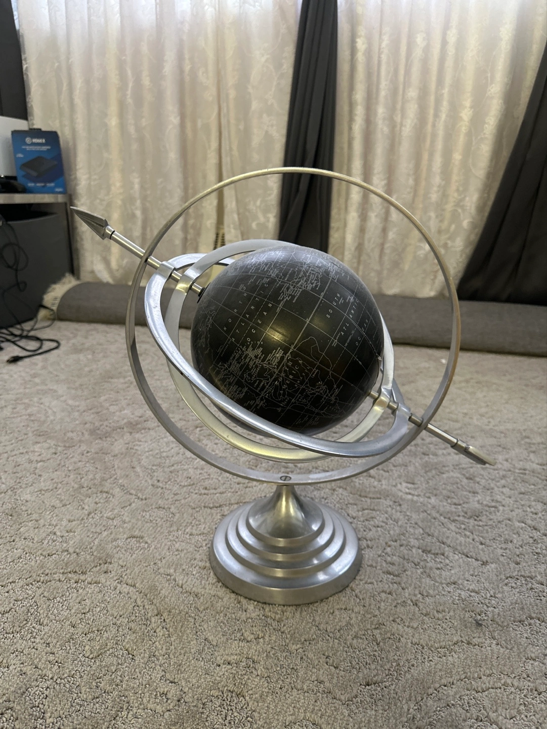 Vintage-style armillary sphere. Features a dark globe and a silver metal stand. Elegant design, great for a home office or study.