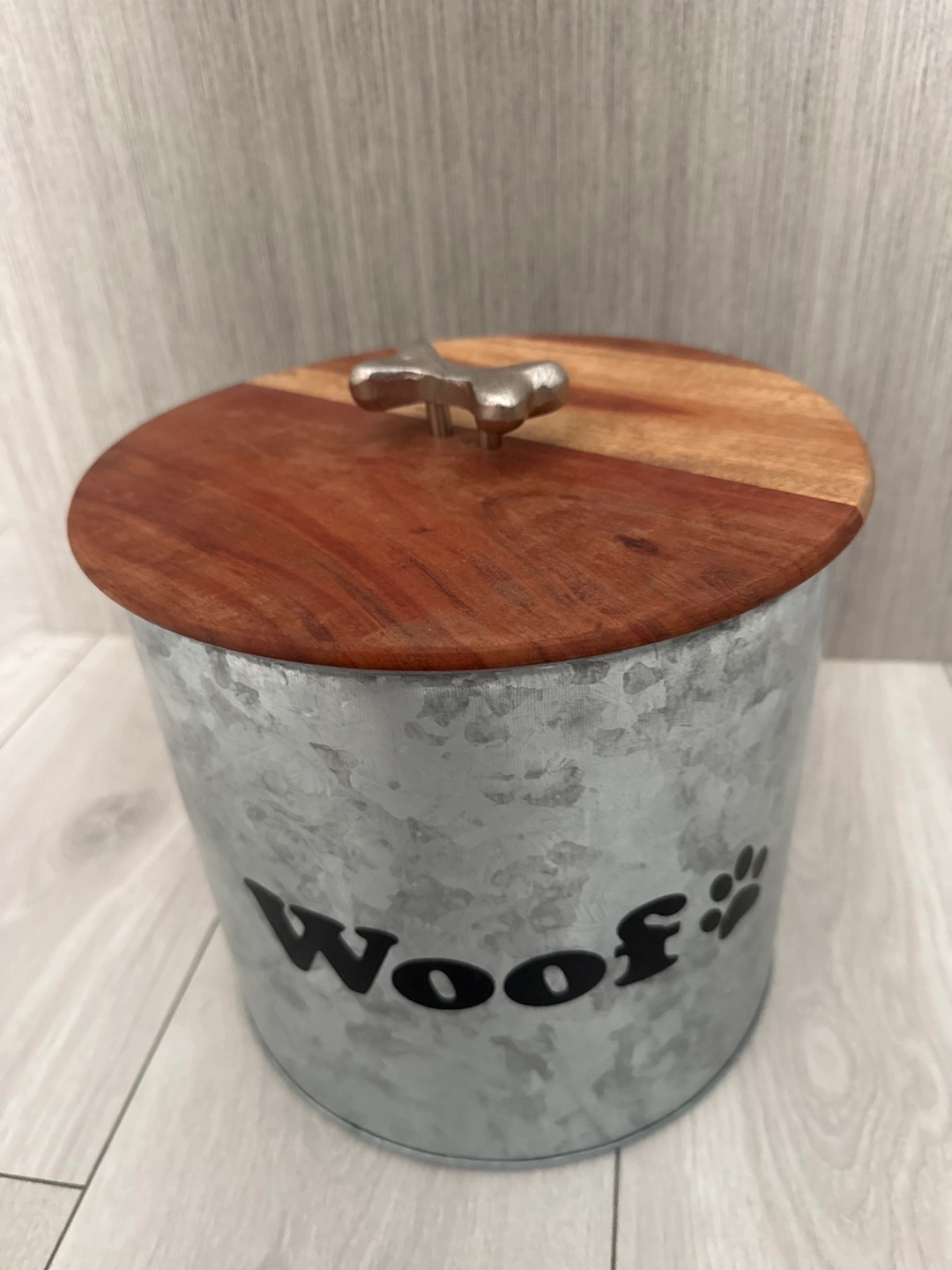 Adorable dog food container. Features a galvanized metal body, wooden lid with bone-shaped handle, and a cute "Woof" decal. Perfect for storing pet food.