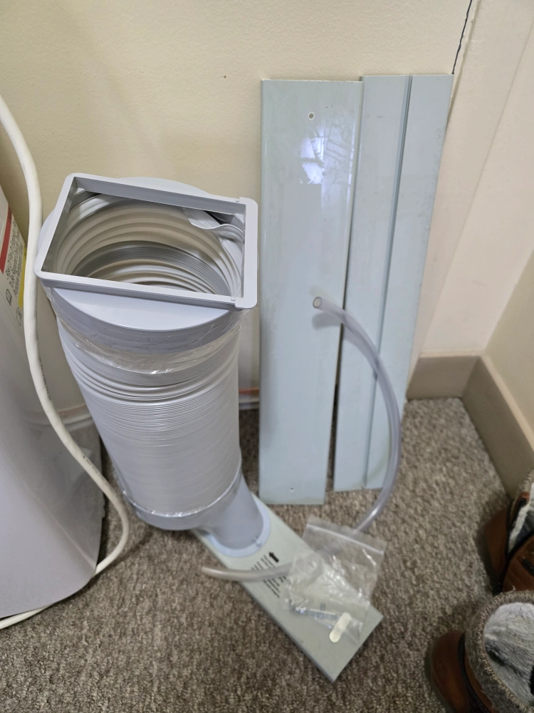Portable air conditioner, includes exhaust hose and window kit. Great for cooling small spaces. Like new condition. Pre-owned, used for 2 years only. moving sale. price has wiggle room but not that much.