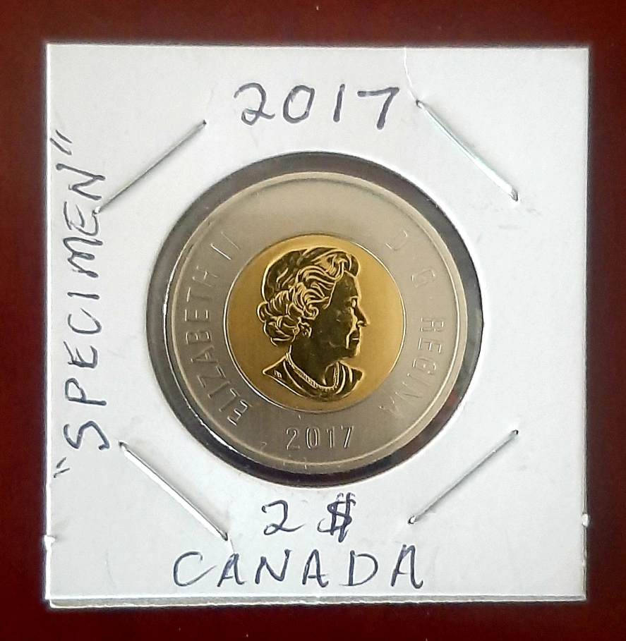 2017 Canadian $2 coin. Specimen coin in holder. Queen Elizabeth II profile. Gold-coloured inner ring.