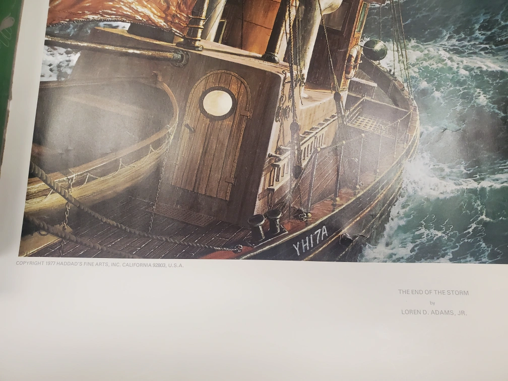 Print of a painting by Loren D. Adams, titled "End of the Storm." The painting depicts a ship battling rough seas during a storm.