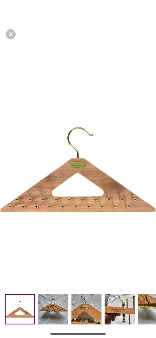 18Triangular wooden sweater hanger. Features multiple small pegs for holding sweaters. Brass hook and accents. Measures approximately 16 inches wide.