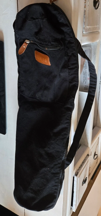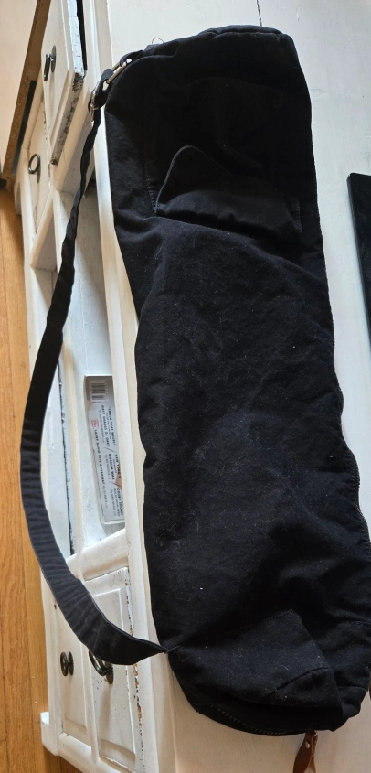 Carry your yoga mat in style. Durable black canvas. Features a zippered pocket and a small front pocket. Adjustable shoulder strap. Great for transporting your mat to and from the studio. pocket for your phone and keys.