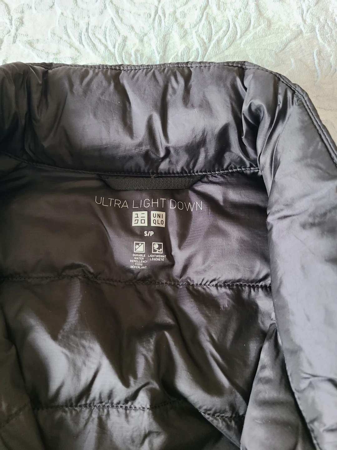 Selling a Uniqlo Ultra Light Down Vest in black, size small. It's lightweight and portable, perfect for layering! The vest is in great condition and ready for a new owner.