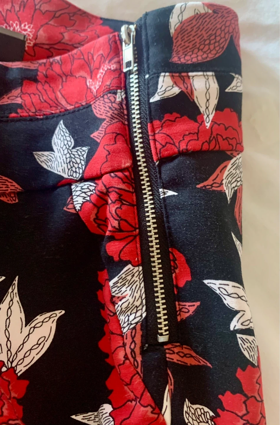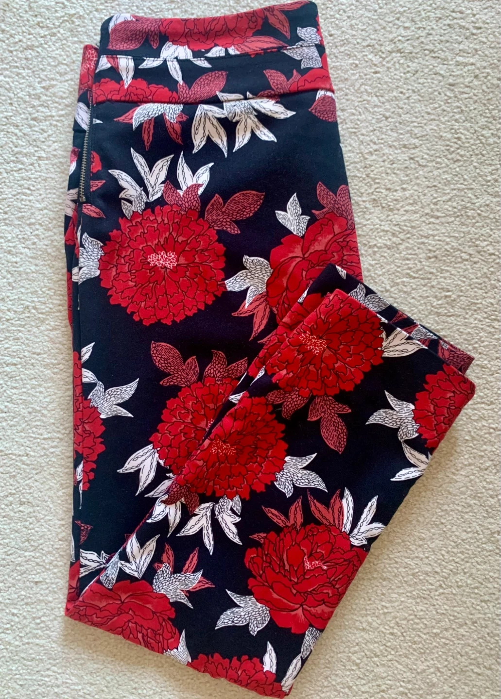 These LE CHÂTEAU pants feature a bold red and white floral print on a black background. Side zipper closure and a size 6 tag. They're a stylish addition to any wardrobe! 25” inseam; I wore as just above ankle pants.