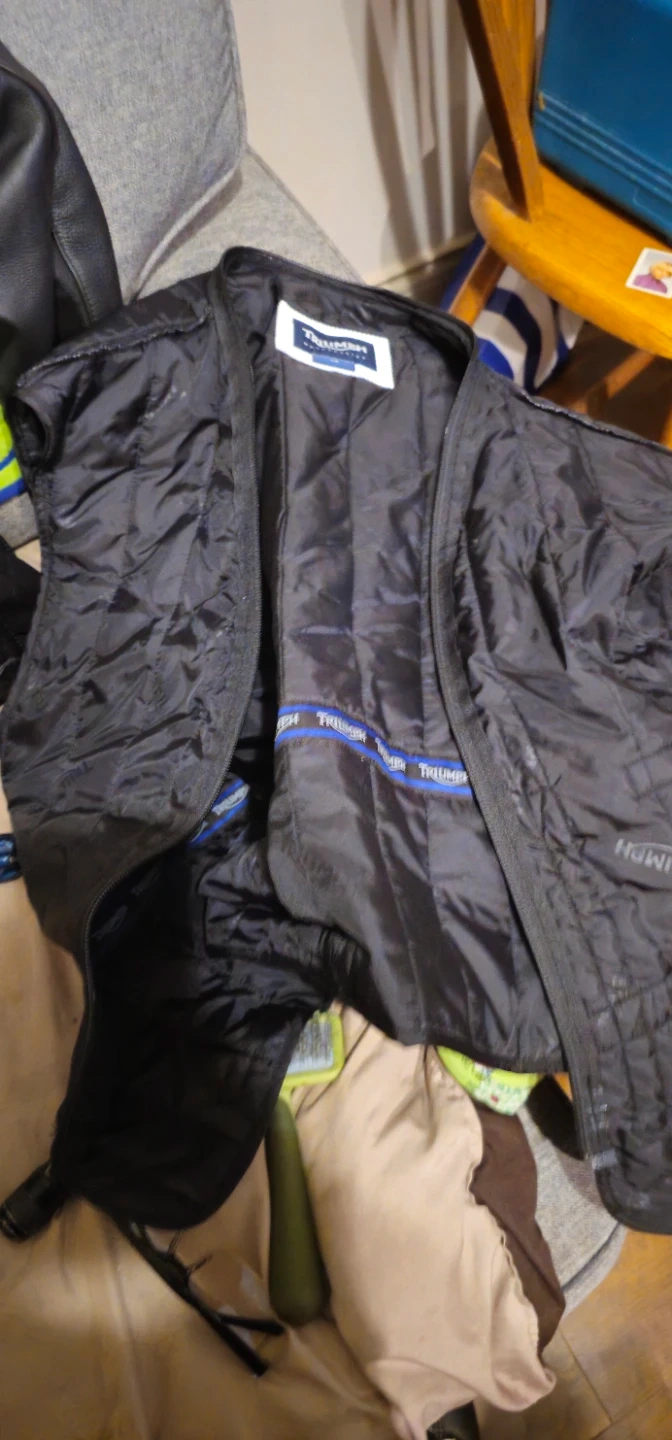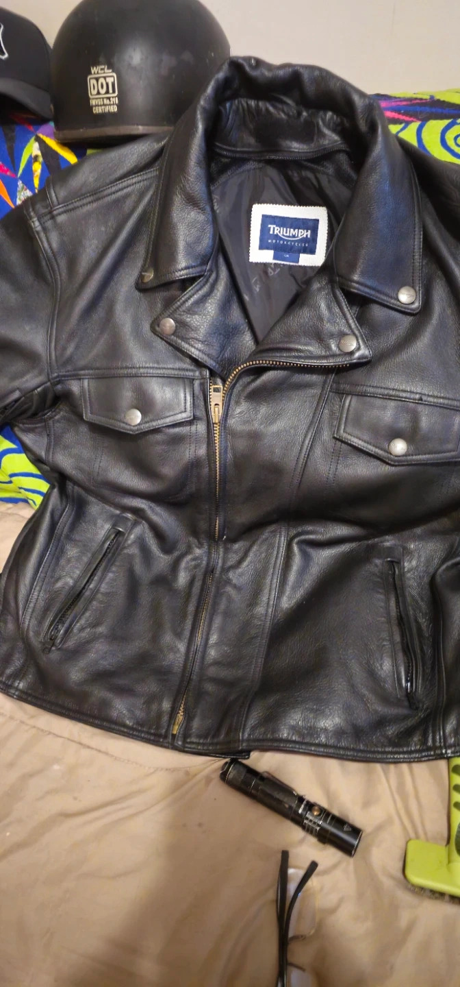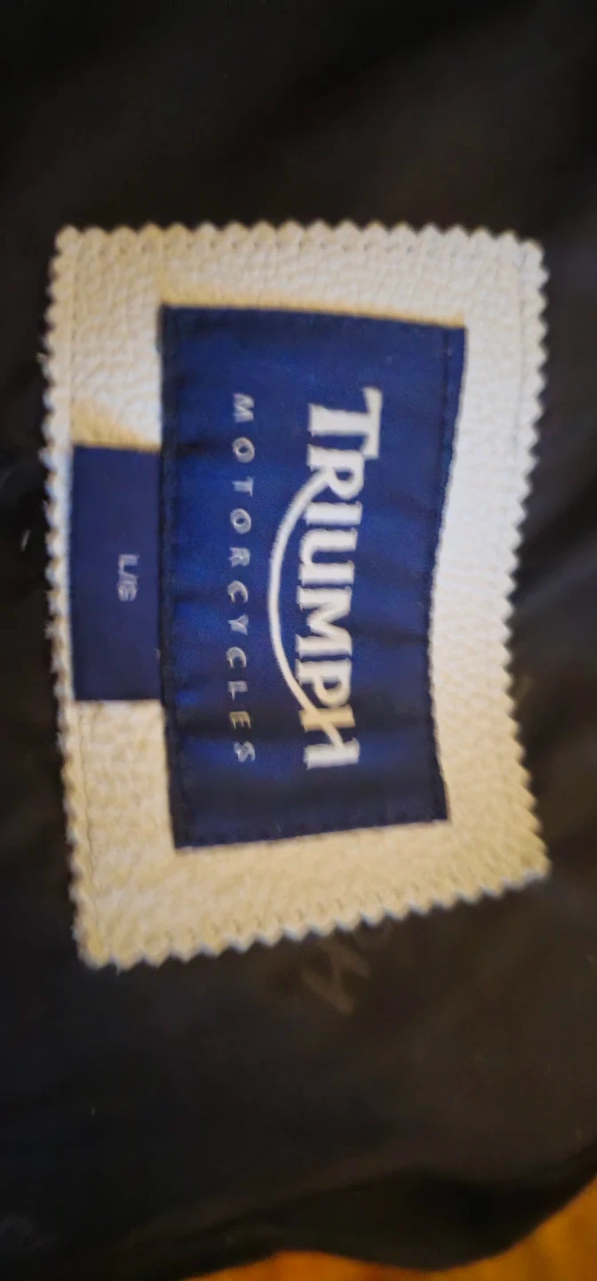 This is a Triumph Motorcycles leather jacket for men. It's a size L/G. Features include a durable leather exterior and a comfortable inner lining.