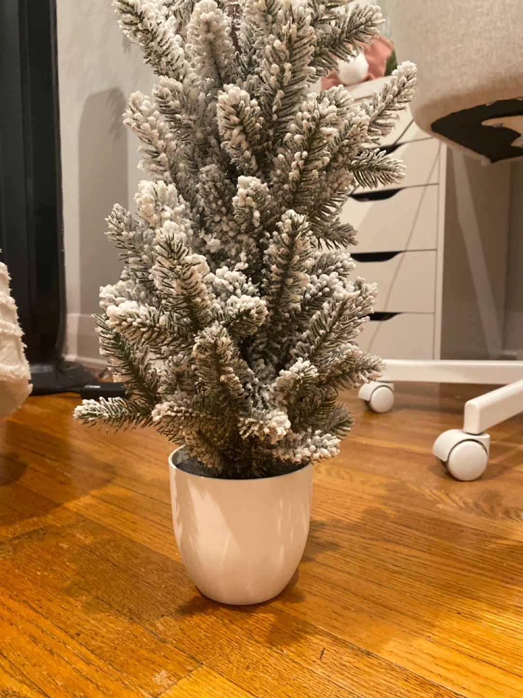 Flocked artificial Christmas tree with snow-like dusting. Comes in a simple white pot. Perfect for small spaces or adding a festive touch to any room during the holidays!