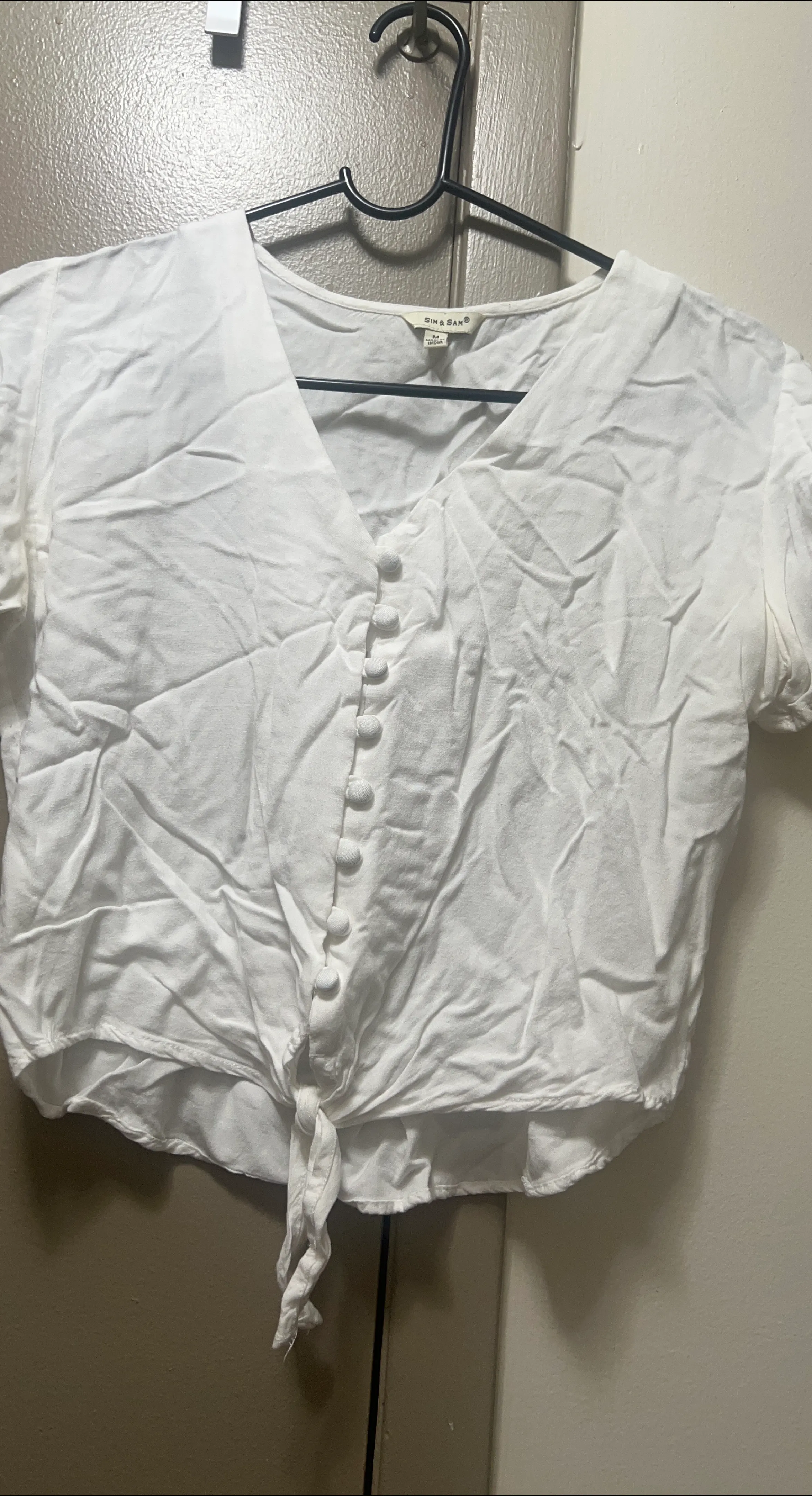 White V-neck blouse from SIM & SAM. Features a button-up front and a tie detail at the hem. It's a size medium with short sleeves. Made of a lightweight fabric, it's perfect for warm weather!