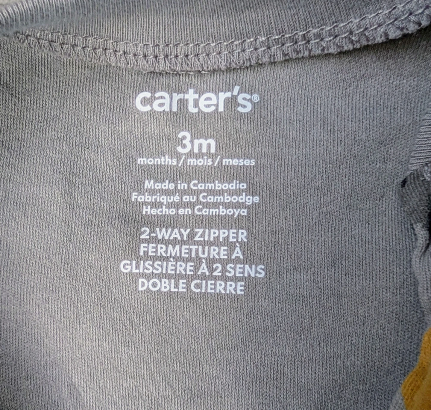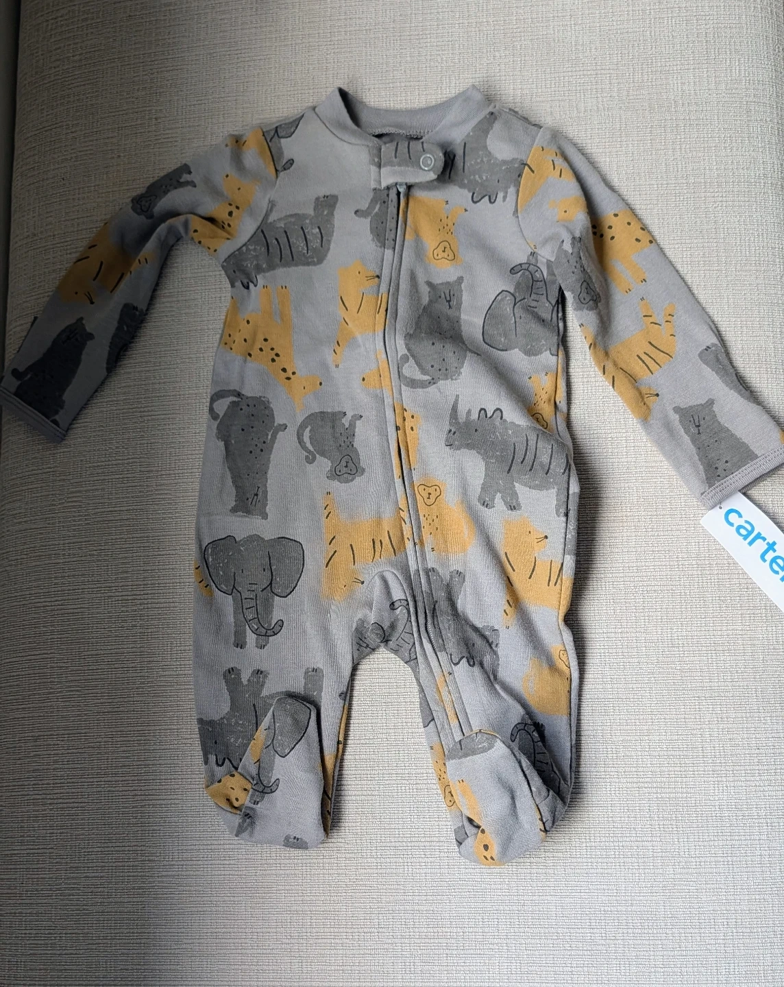 Carter's baby sleepsuit in a 3-month size with a cute animal print. It features a 2-way zipper for easy changes. Made from soft fabric for comfy wear. Perfect for everyday use or bedtime!