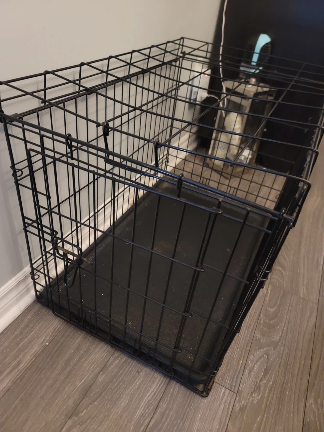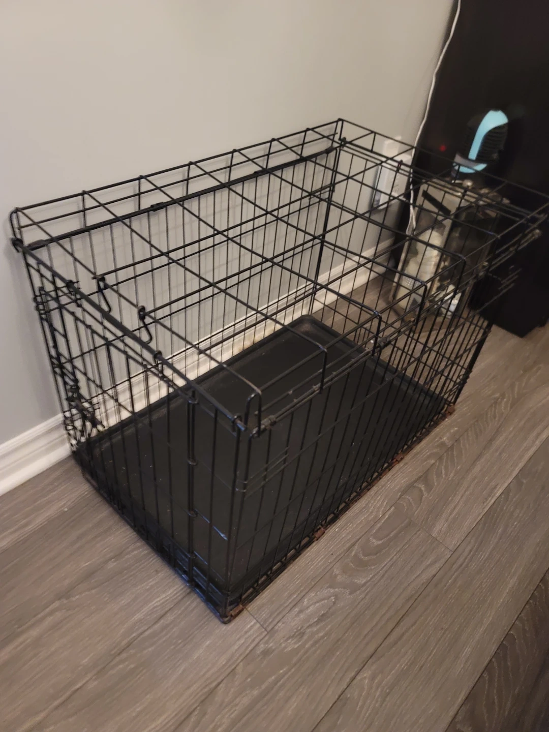 A standard wire dog crate with a black finish. It comes with a plastic tray for easy cleaning. This crate is suitable for training or travel.