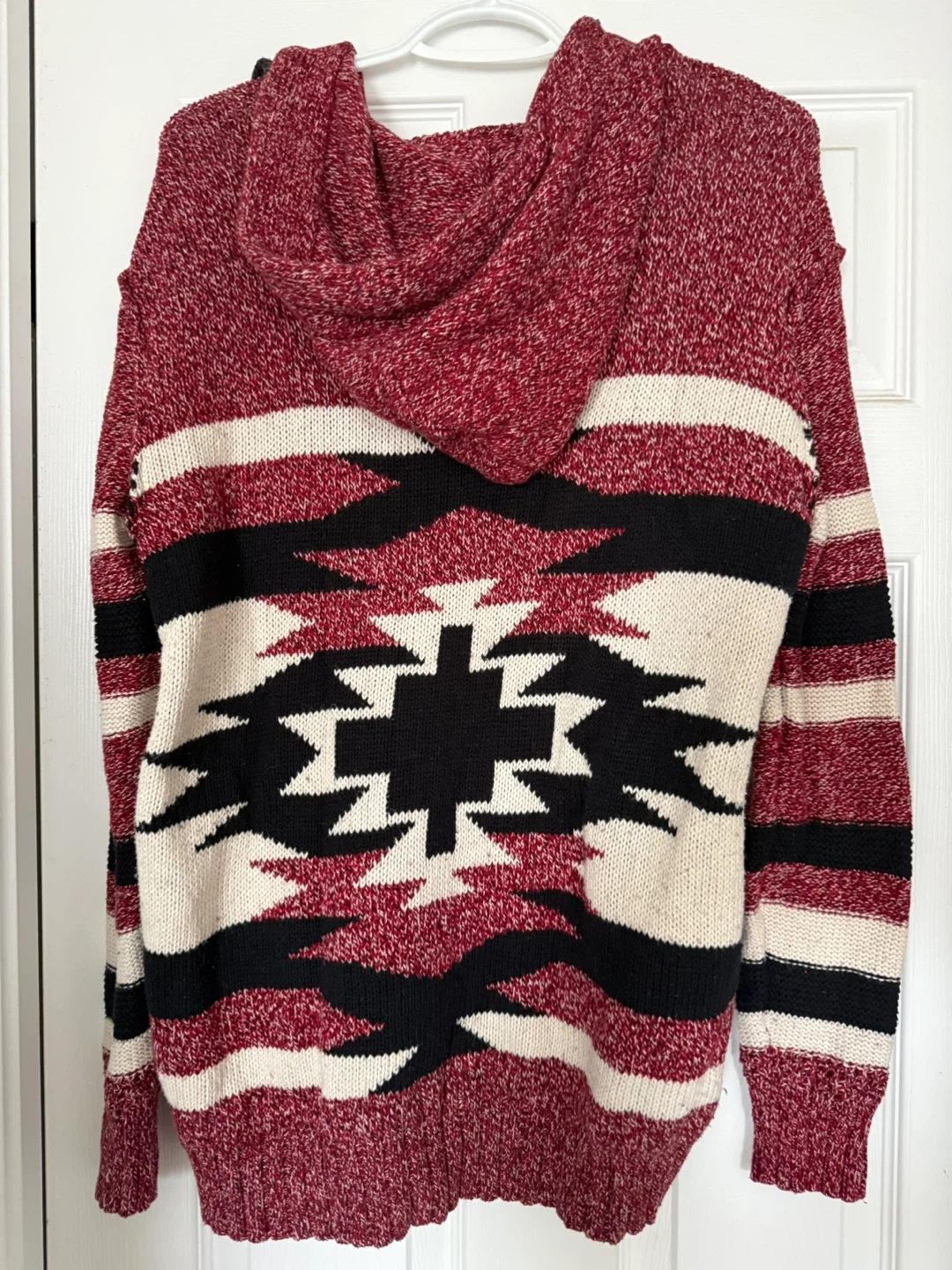 Cozy American Eagle hooded henley sweater featuring a bold Aztec-inspired print. It's made from a soft knit material, perfect for cooler weather. The front has a button-up placket and a front pouch pocket. This sweater is a great layering piece for casual wear.