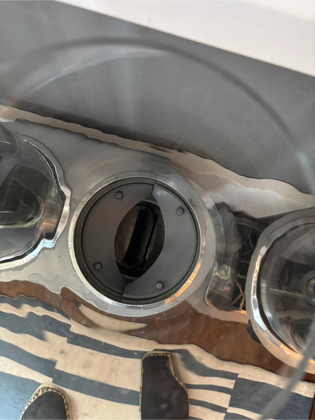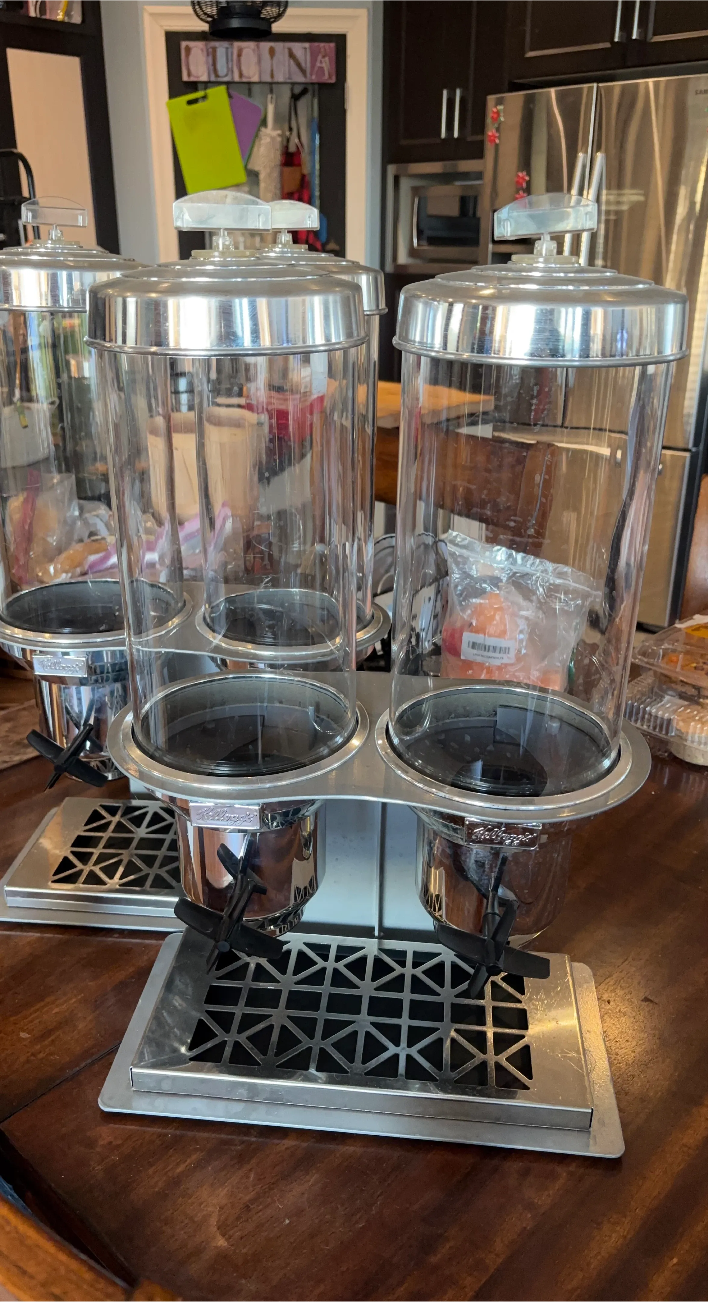 Commercial-style metal base cereal dispenser with four clear tubes and silver-tone accents. Each section features a dispensing mechanism for easy portion control. Ideal for breakfast bars or buffet settings. 14”w 26”h 8”d, with 6” x 11” h round tubes.