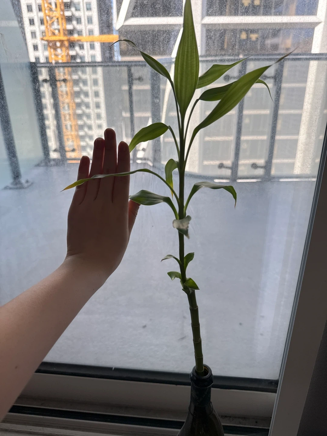 A vibrant lucky bamboo stalk growing from a repurposed wine bottle. It's a unique piece for any home or office space. This plant adds a touch of green and is known for its easy care.