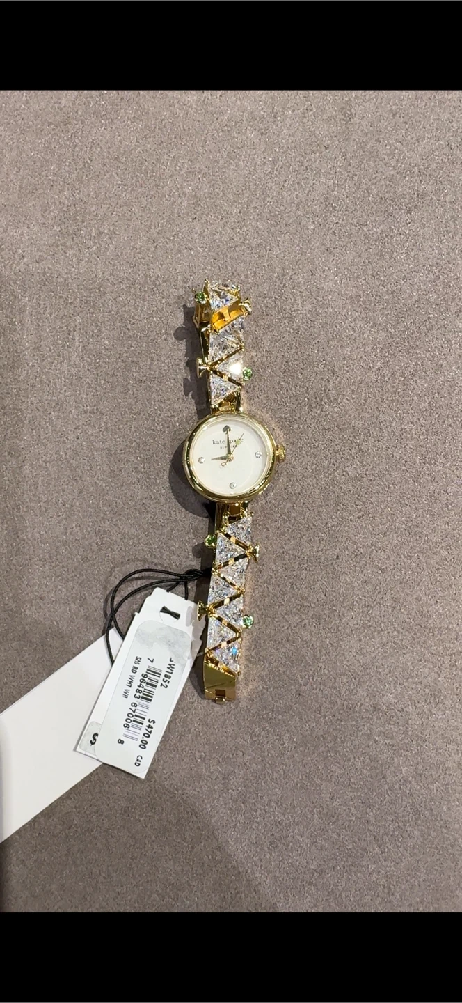 Beautiful gold-tone Kate Spade watch featuring a white dial and sparkling crystal accents on the band. It comes with its original box.