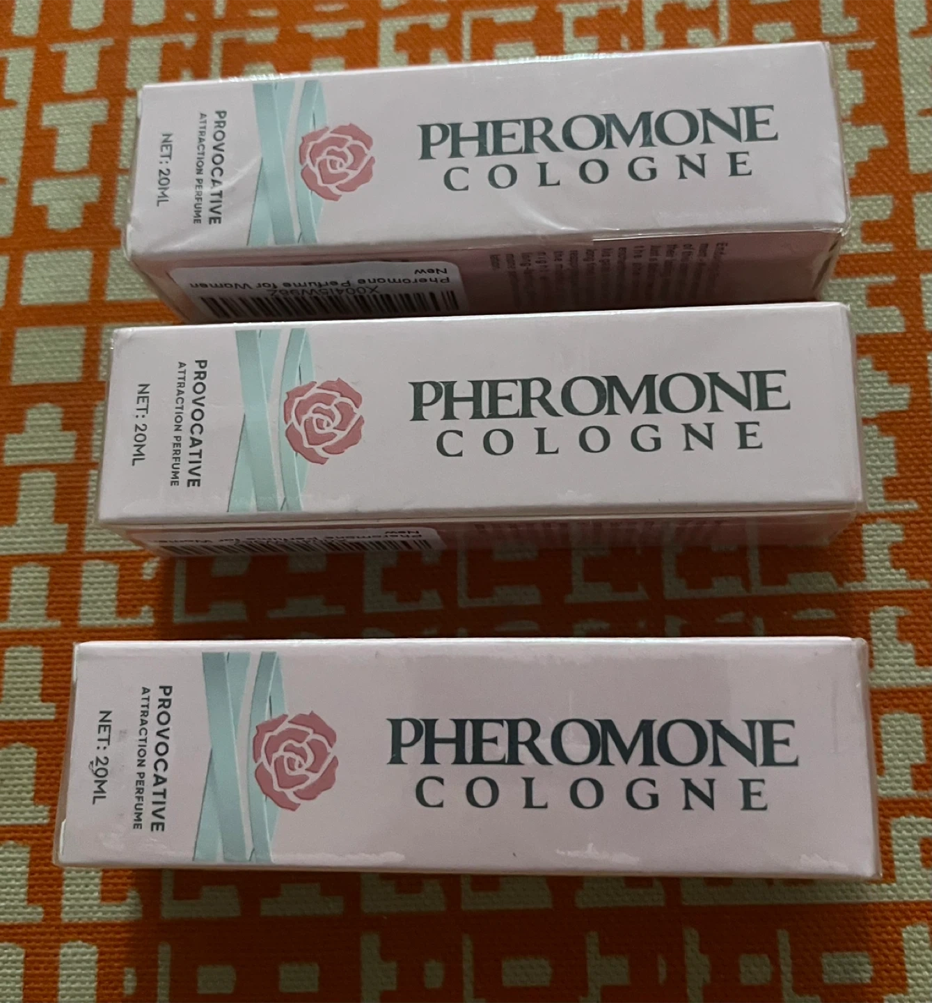 Three 20ml bottles of Provocative Pheromone Cologne. Manufacturing date is February 13, 2025, with an expiry date of February 18, 2028. It's an attraction perfume.