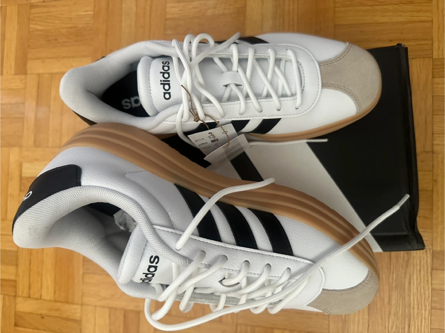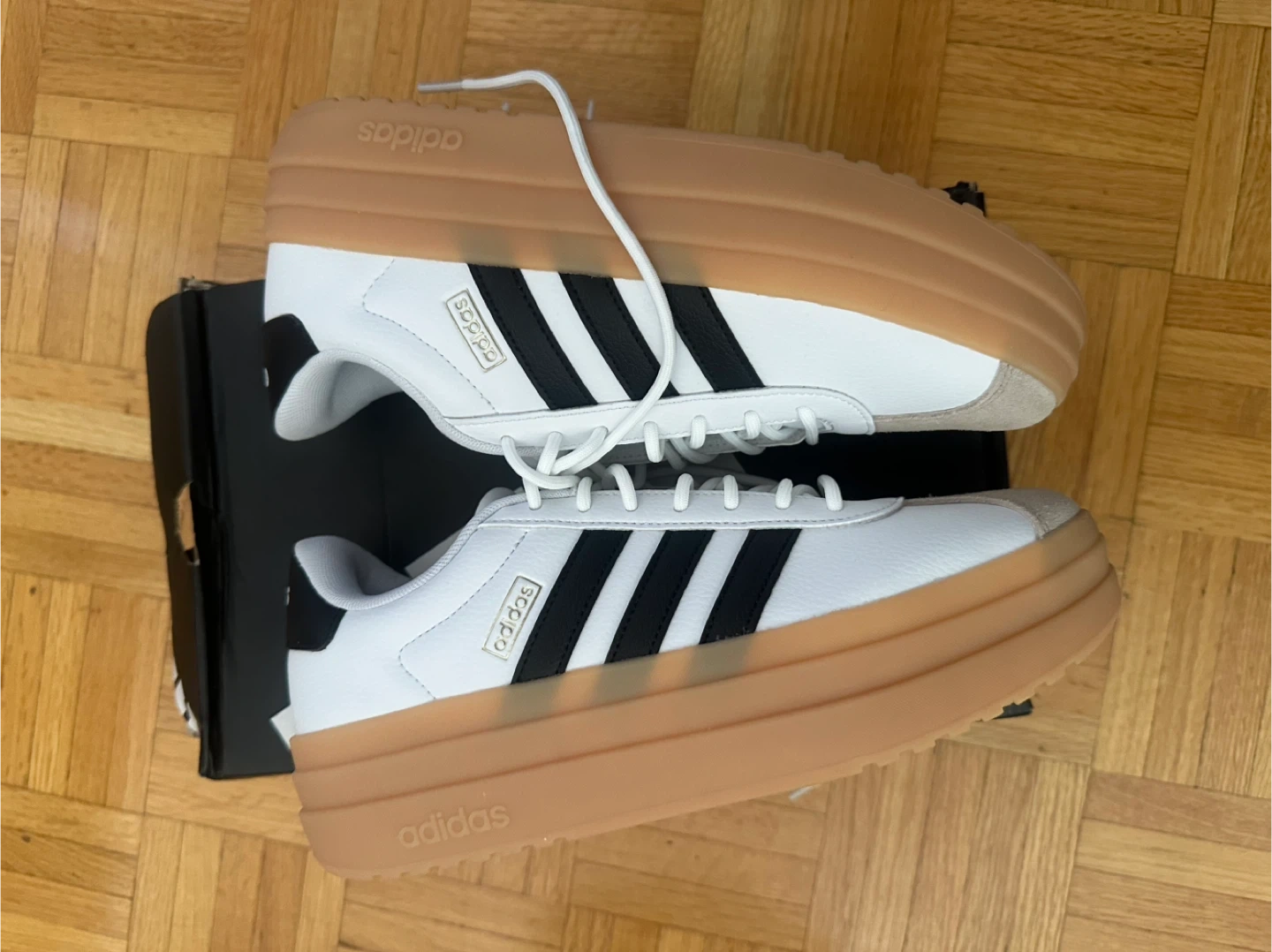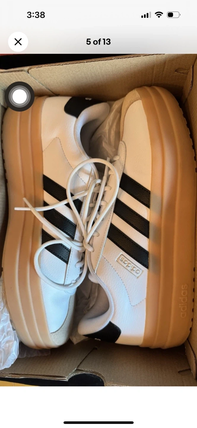 These Adidas sneakers are white with black stripes and a gum sole. They're a women's size 7. Includes original box.