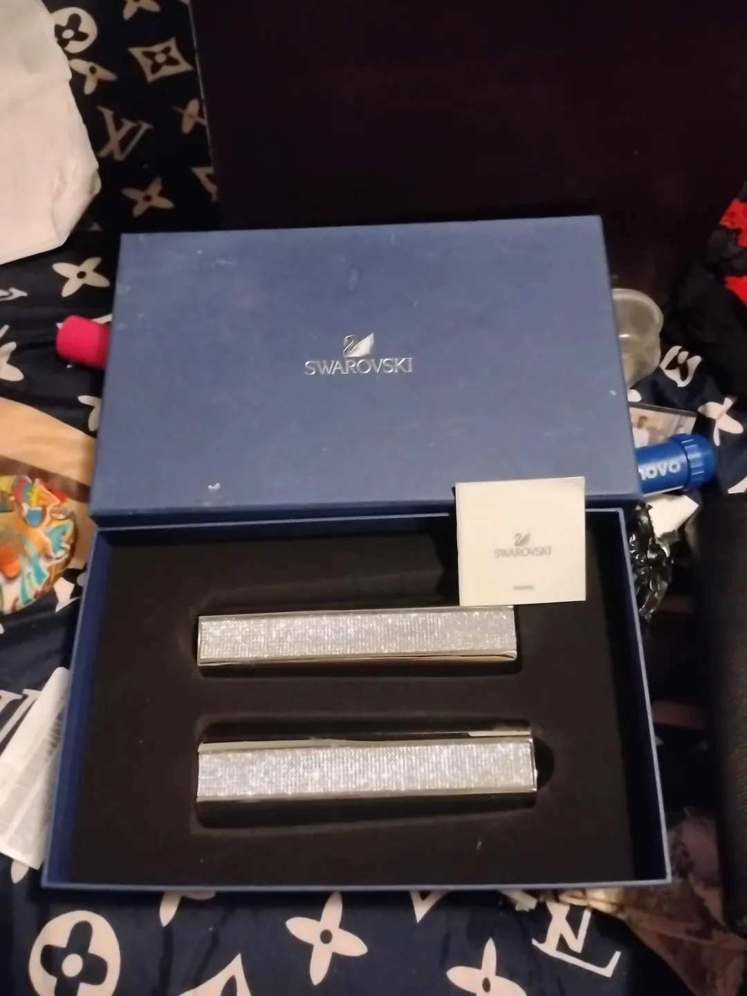 A beautiful set of two Swarovski crystal candle holders. They're encrusted with sparkling crystals for a luxurious look. Includes original box and authenticity booklet. Measures approx. 6 inches tall each.