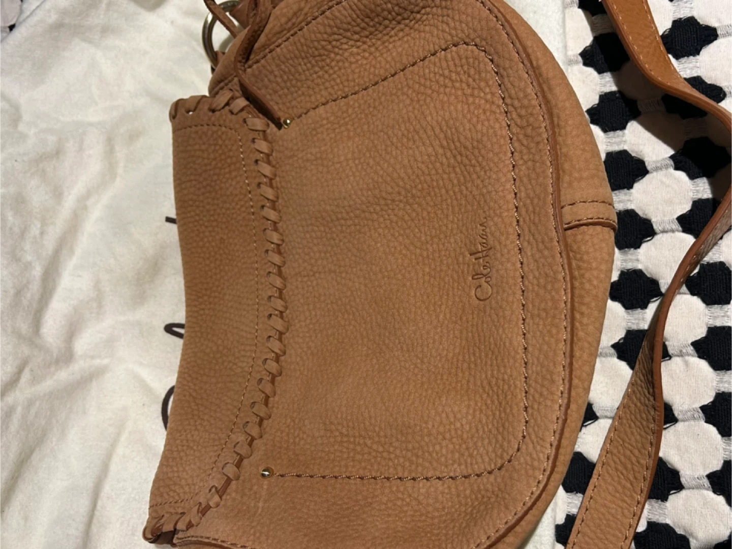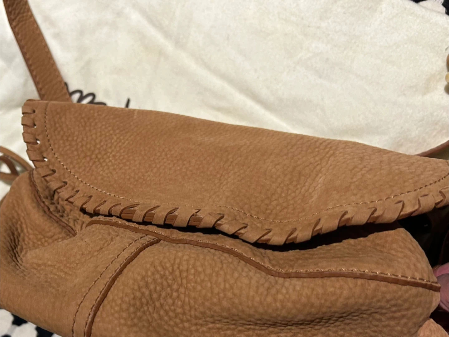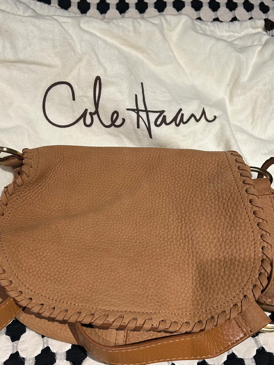 Beautiful tan leather shoulder bag from Cole Haan. It features braided accents and a secure flap closure. The interior has a couple of slip pockets for organization. This bag's versatile design makes it suitable for everyday use.