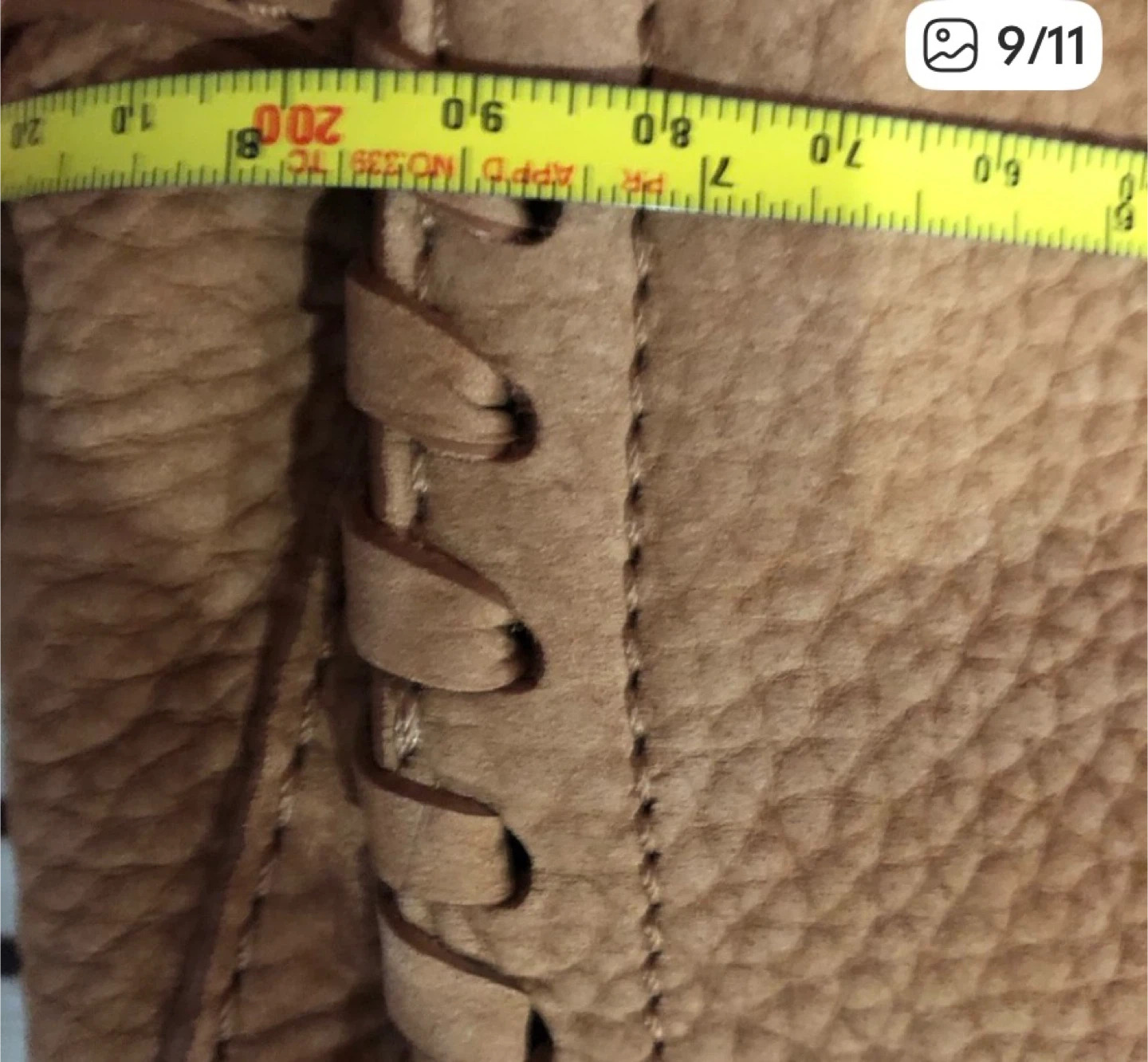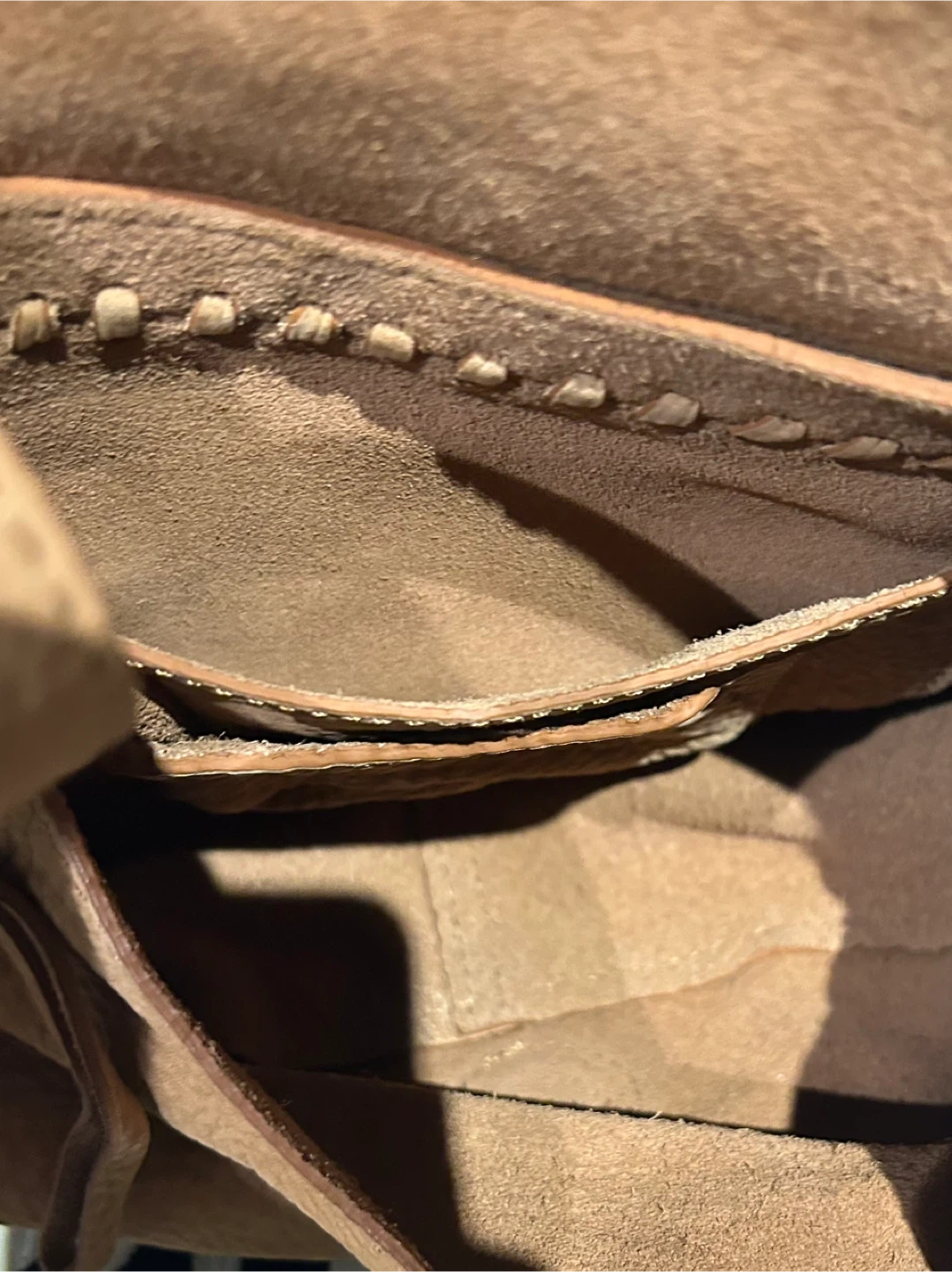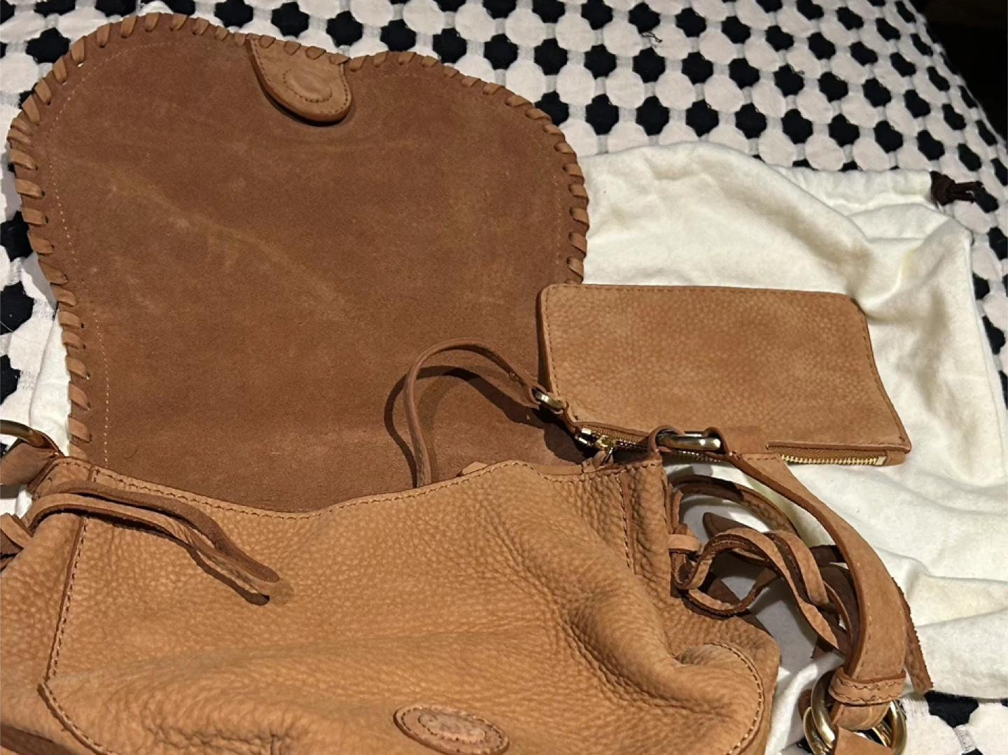 Beautiful tan leather shoulder bag from Cole Haan. It features braided accents and a secure flap closure. The interior has a couple of slip pockets for organization. This bag's versatile design makes it suitable for everyday use.