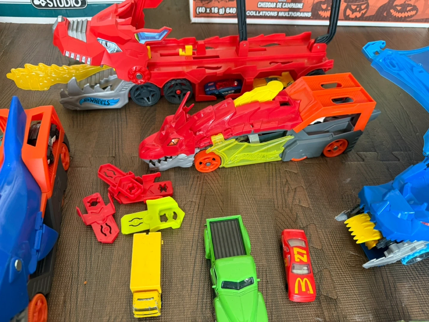 This set includes a Hot Wheels Dragon Hauler toy truck and several assorted Hot Wheels cars. It's a great collection for any young car enthusiast! Still in great condition! Pick up only. North York.