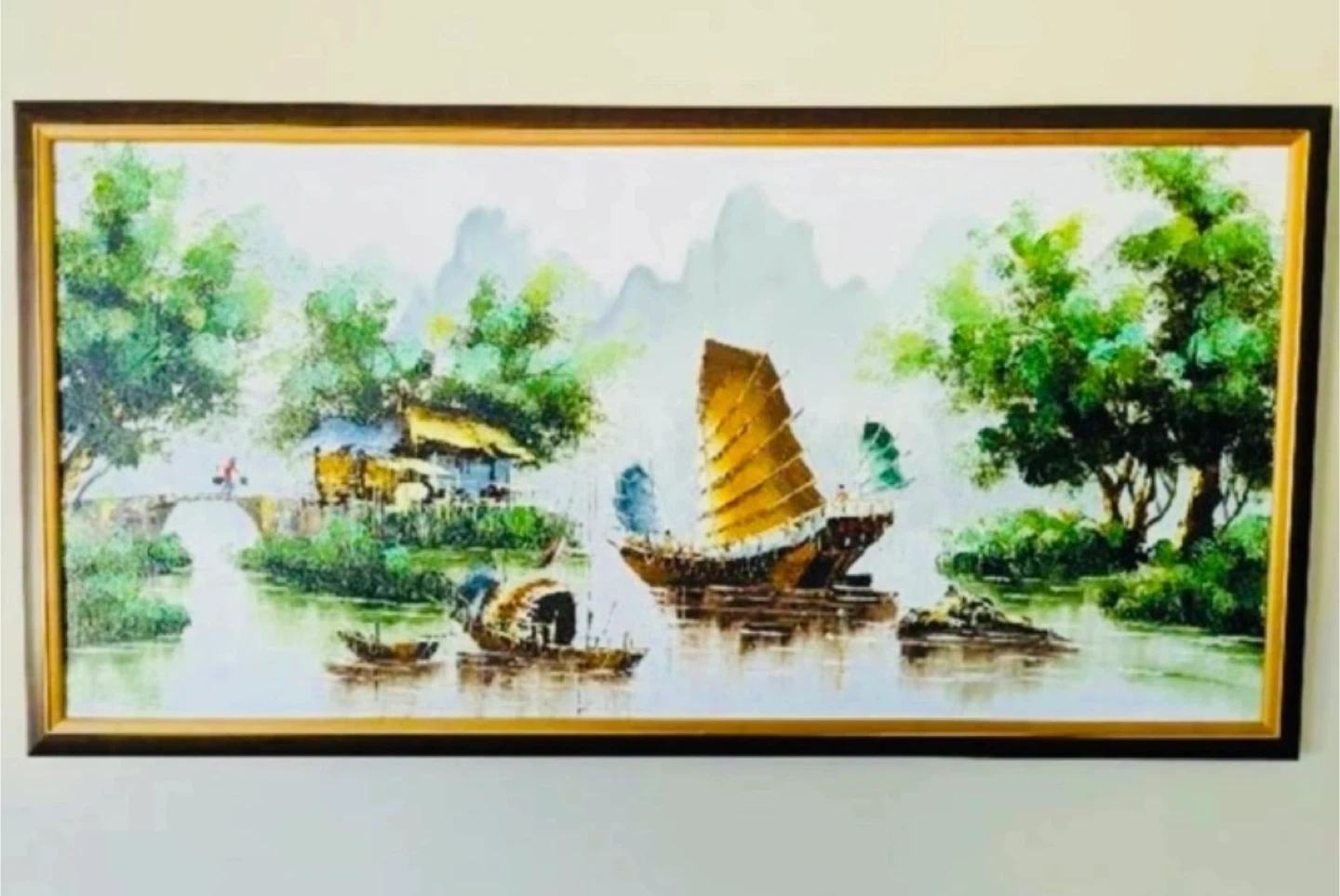 64A framed painting of a tranquil landscape scene with boats and greenery