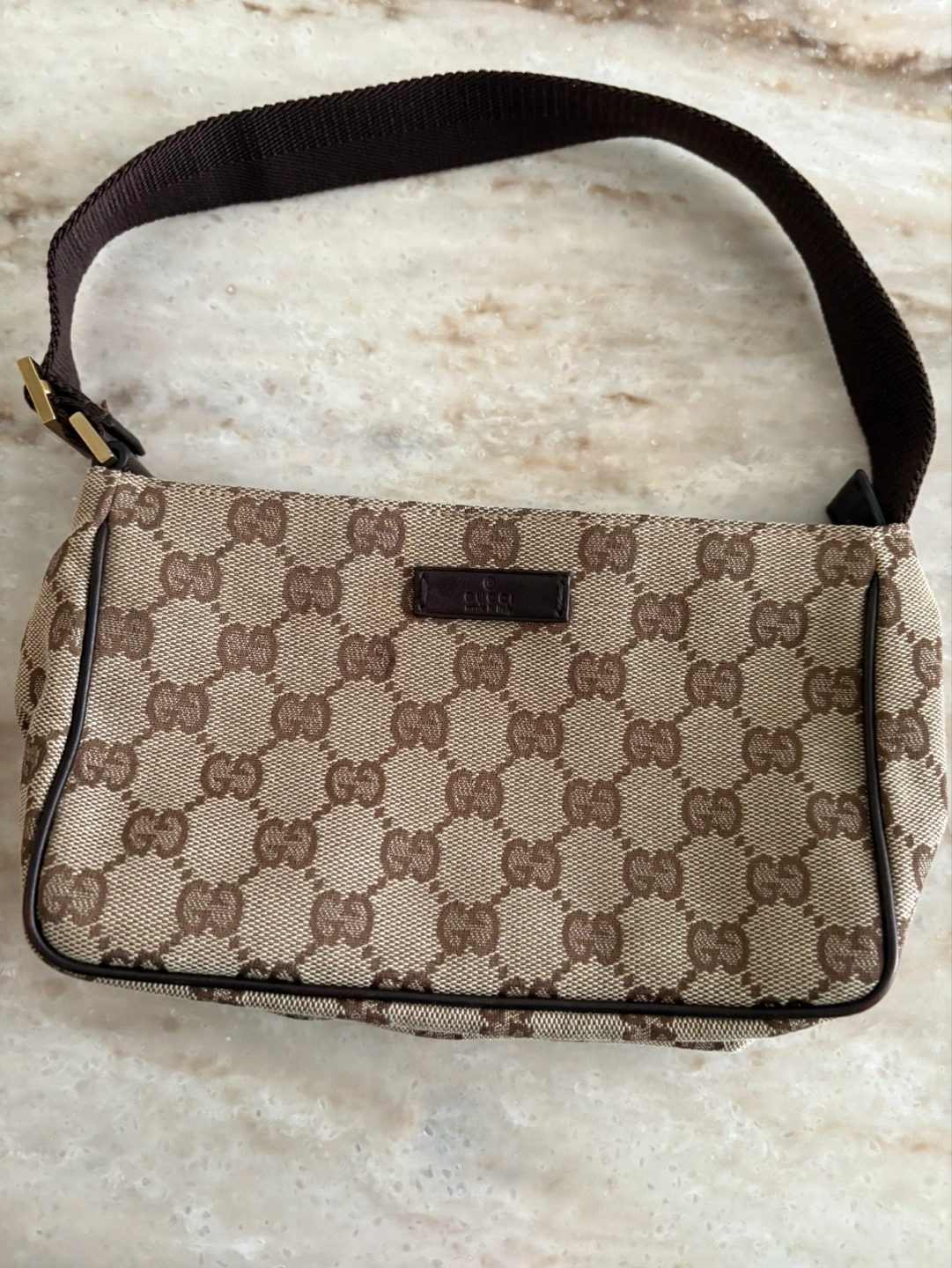 Authentic Gucci handbag. Beige and brown GG canvas. Like new. Used once or twice. Brown leather trim. Small size, perfect for everyday use. Zipper closure. Interior pocket.