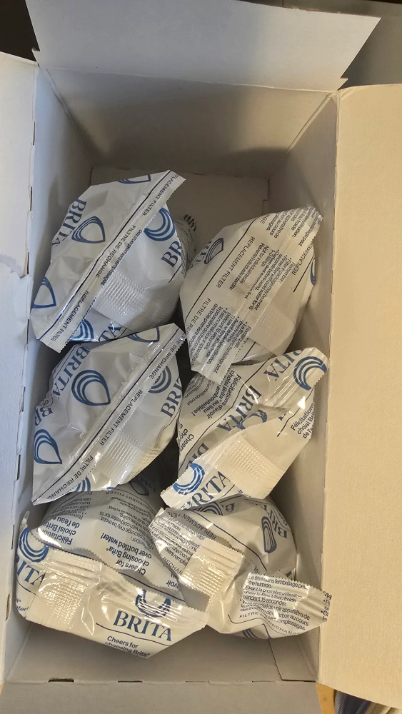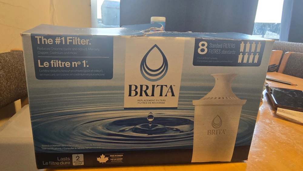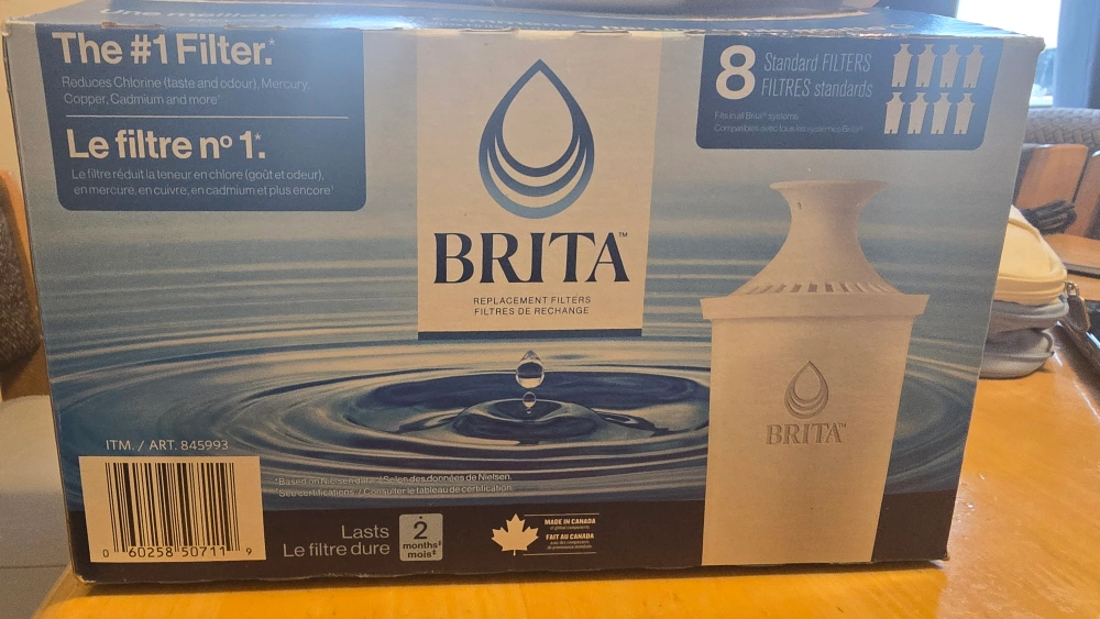 Eight Brita standard replacement water filter cartridges. Reduces chlorine taste and odour. Made in Canada. Two-month filter life.