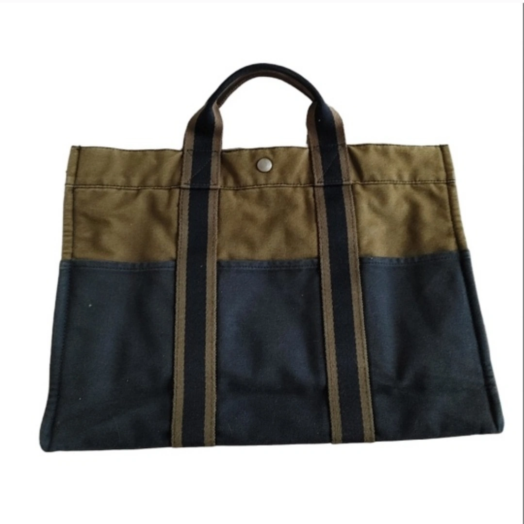 HERMÈS Navy & Khaki Green Toile Fourre-Tout GM Bag. Condition: Preloved. Moderate fading & scuffs. Bottom corners are slightly worn in with light fraying on one corner but no holes through the bag. Hardware has tarnish on the snap. See photos for details. Details: Toile Lining & Single Interior Pocket. Snap closure. Side snaps. Six Exterior Pockets. Palladium-Plated Hardware. Green Toile H Canvas Body. Made in France. Measurements are approximately: - Width 16.5" x depth 4" x height 11.5" - Handle drop 4" Message with any questions.