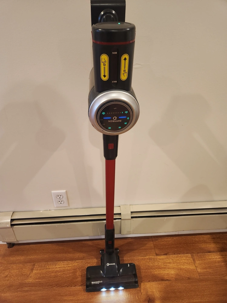Lightweight, cordless stick vacuum. Multiple settings although the battery doesn't last too long on full power. Great for quick cleanups and smaller spaces. Easy disassembly for cleaning and throwing away dirt.