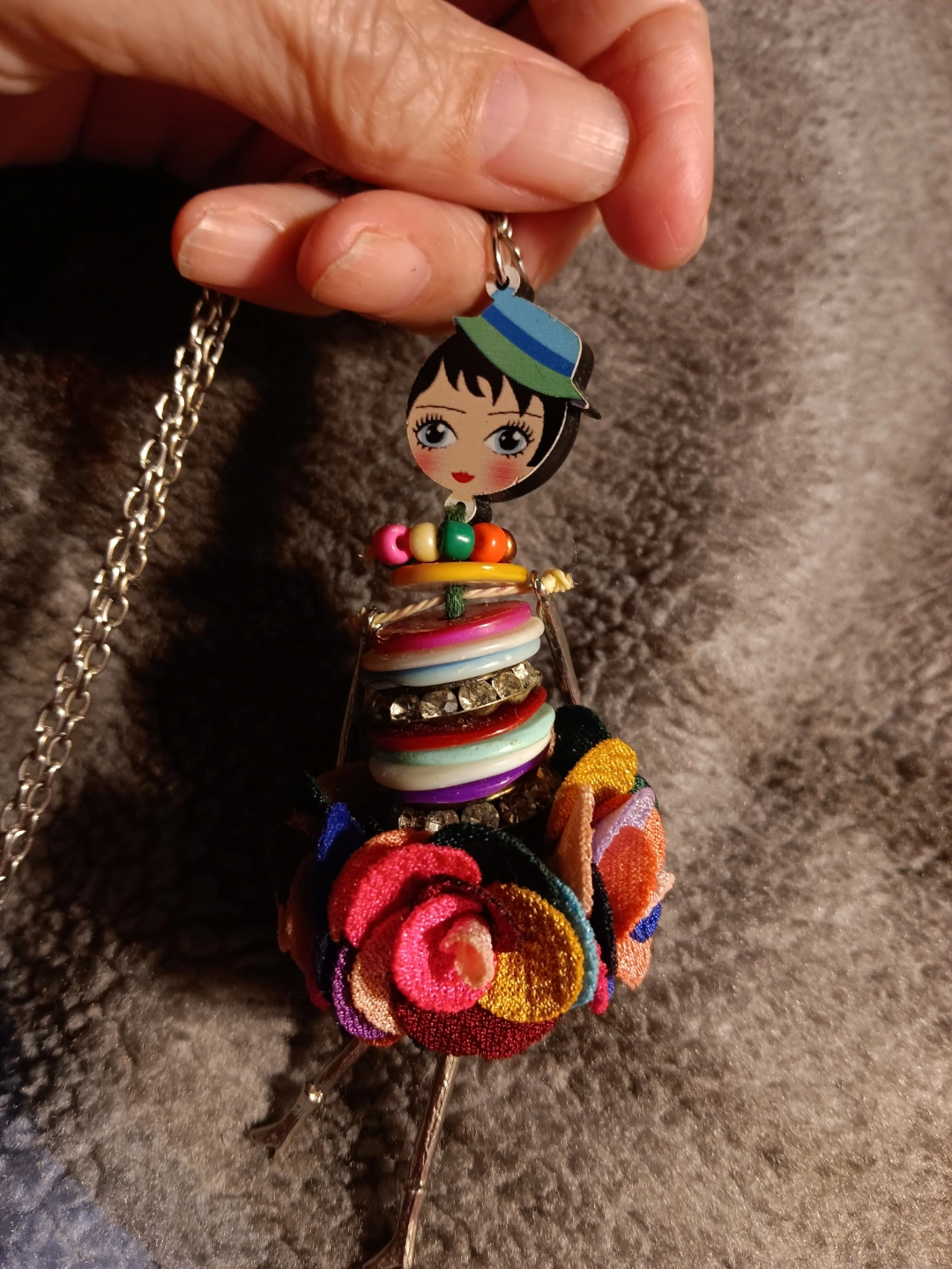 Colorful handmade necklace. Features a whimsical doll design. Layered buttons and fabric flowers. Silver chain. Great statement piece.