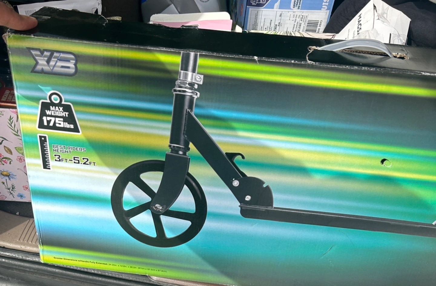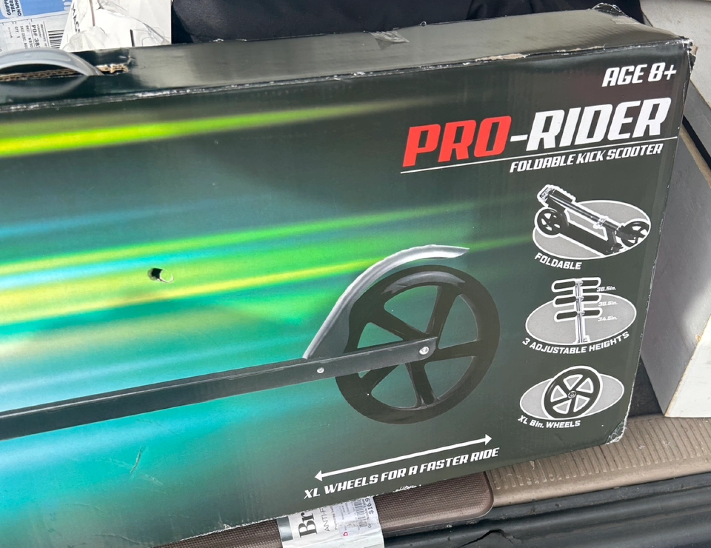 Foldable kick scooter. Features XL wheels for a faster ride and 3 adjustable heights. Suitable for ages 8+. Max weight 175 lbs. Best riders height 3 ft - 5.2 ft.