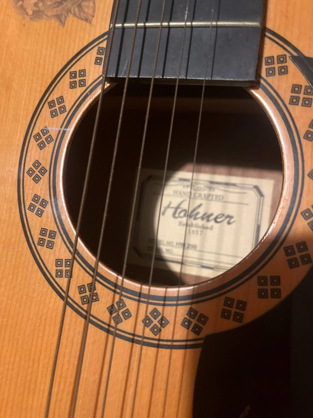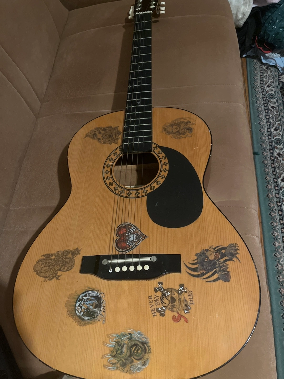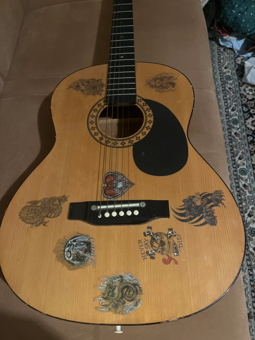 Cool vintage acoustic guitar. Six strings. Features several stickers. Handcrafted in England. Model number 200/200.