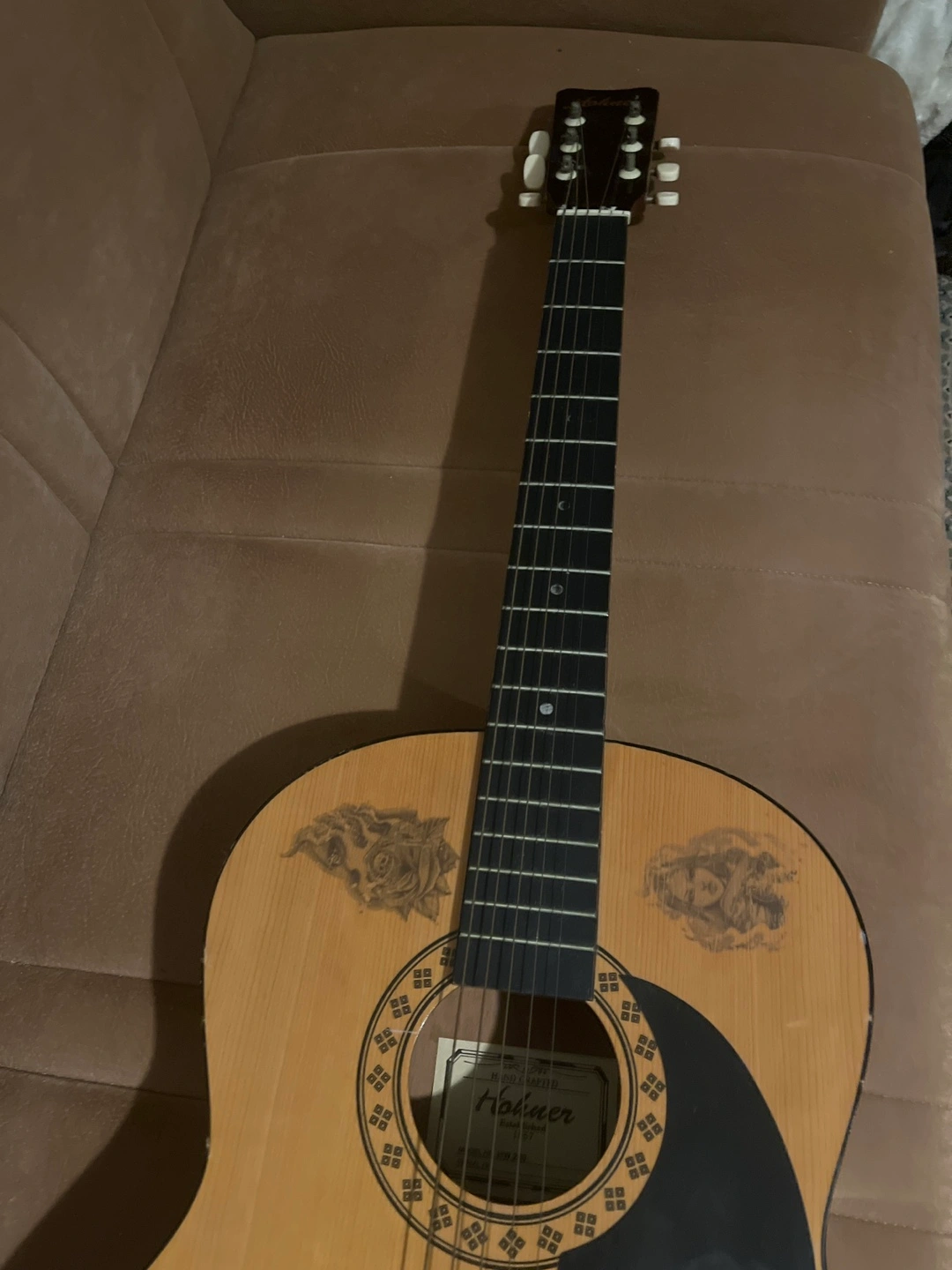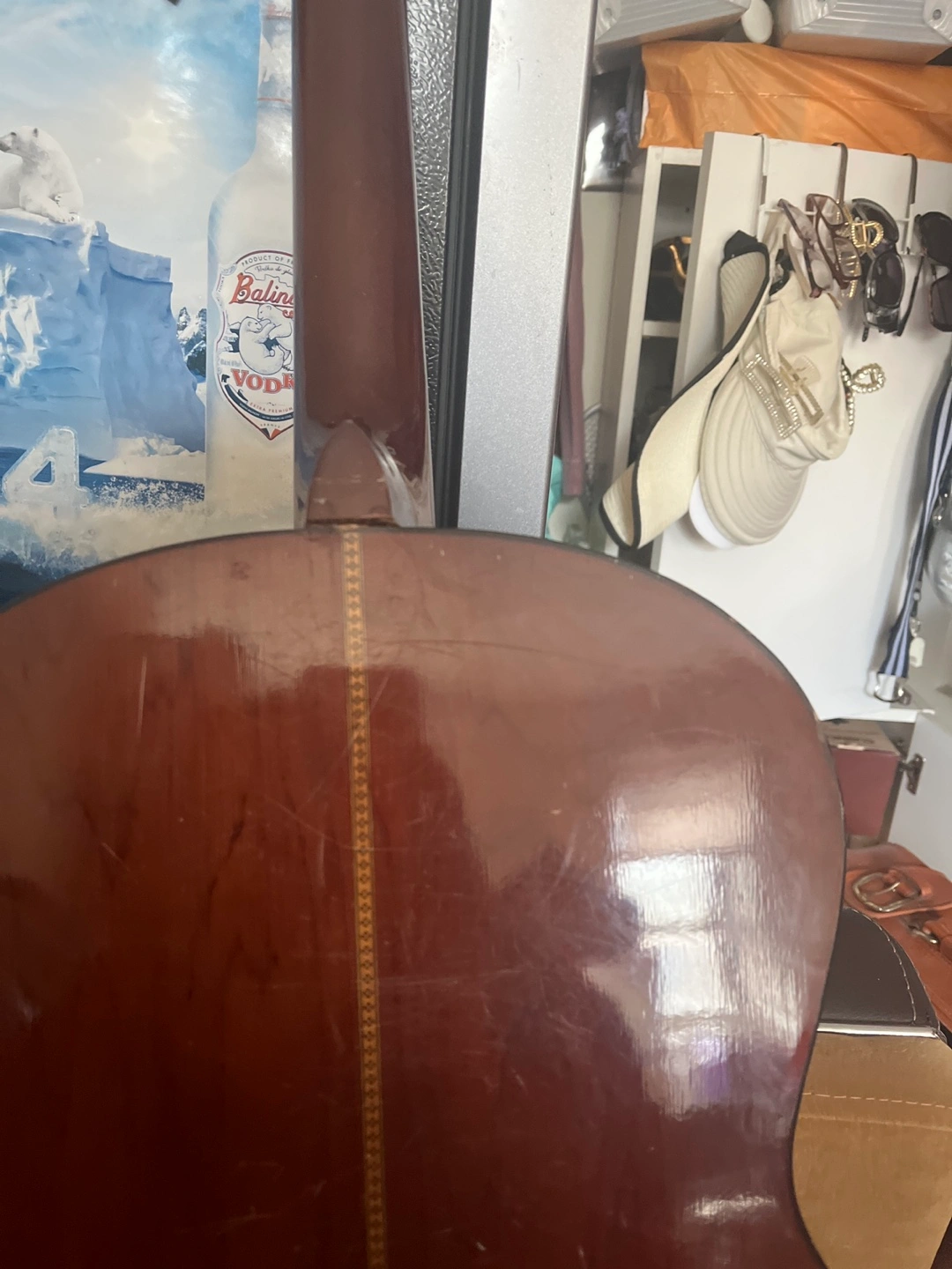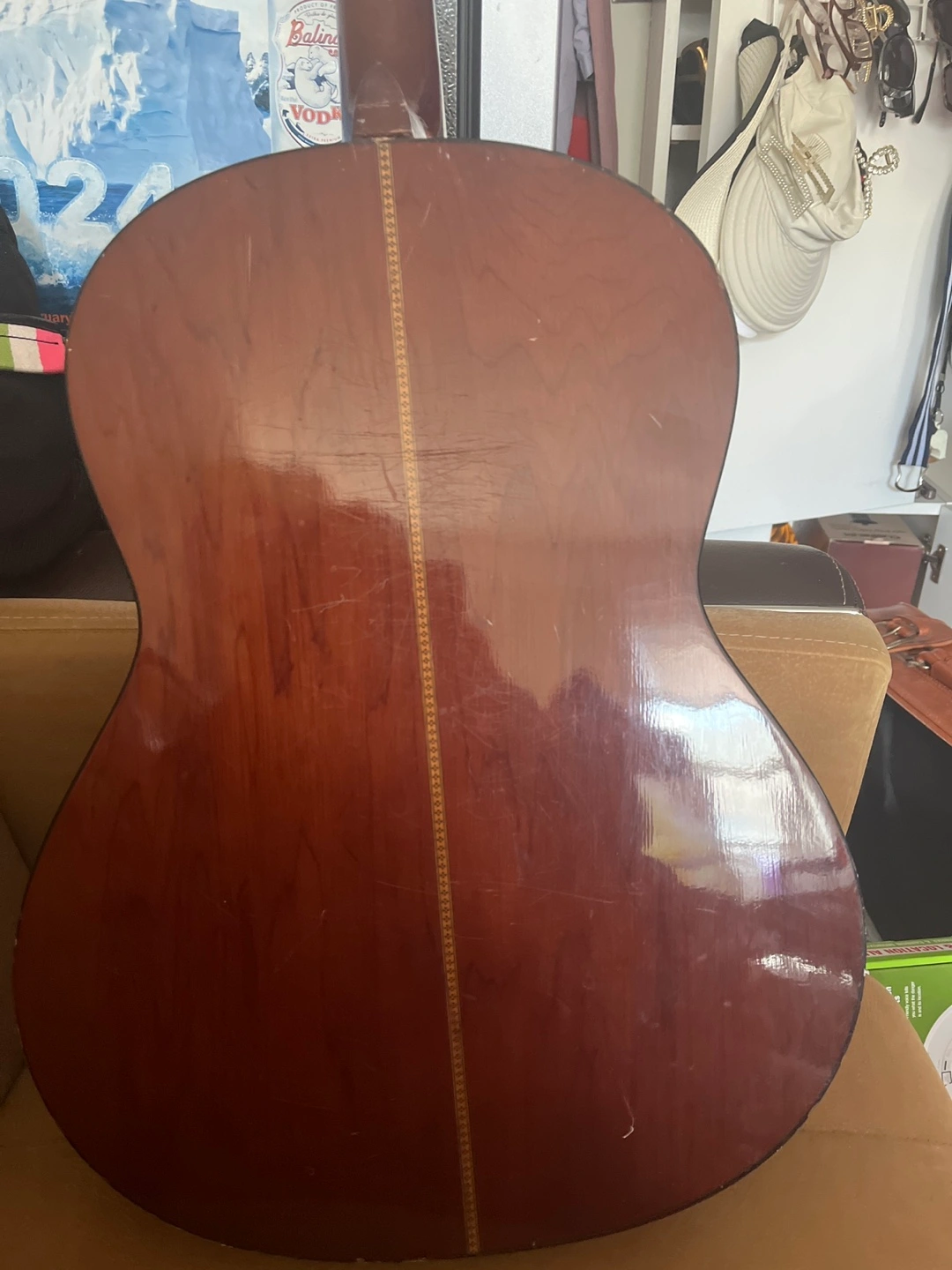 Cool vintage acoustic guitar. Six strings. Features several stickers. Handcrafted in England. Model number 200/200.