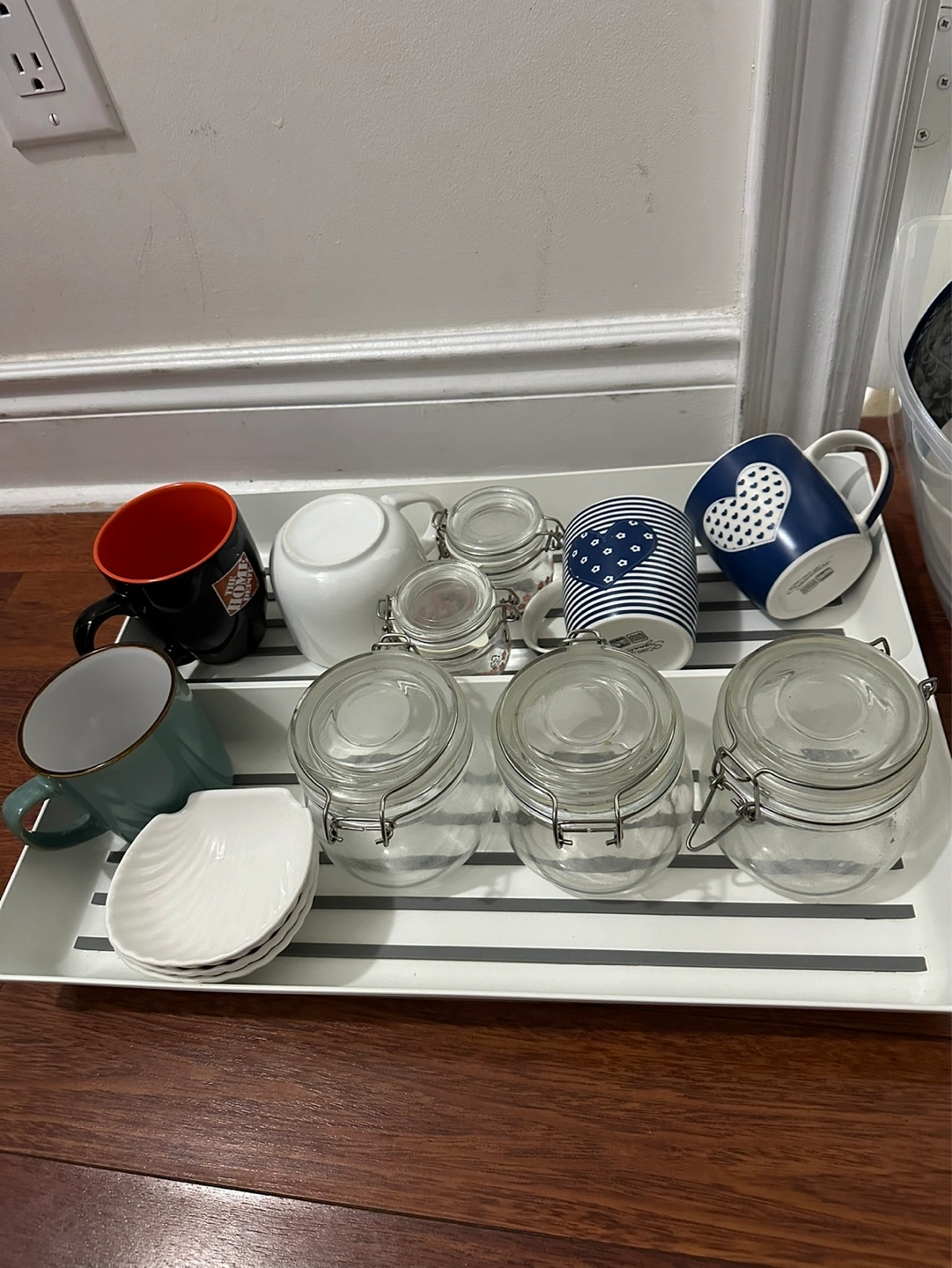 Set of mugs, glass jars, and small dishes. Various colours and patterns. Ideal for organizing or serving.