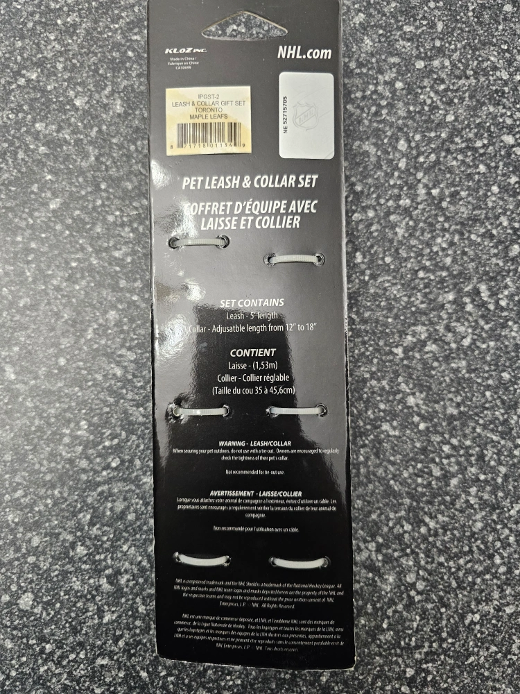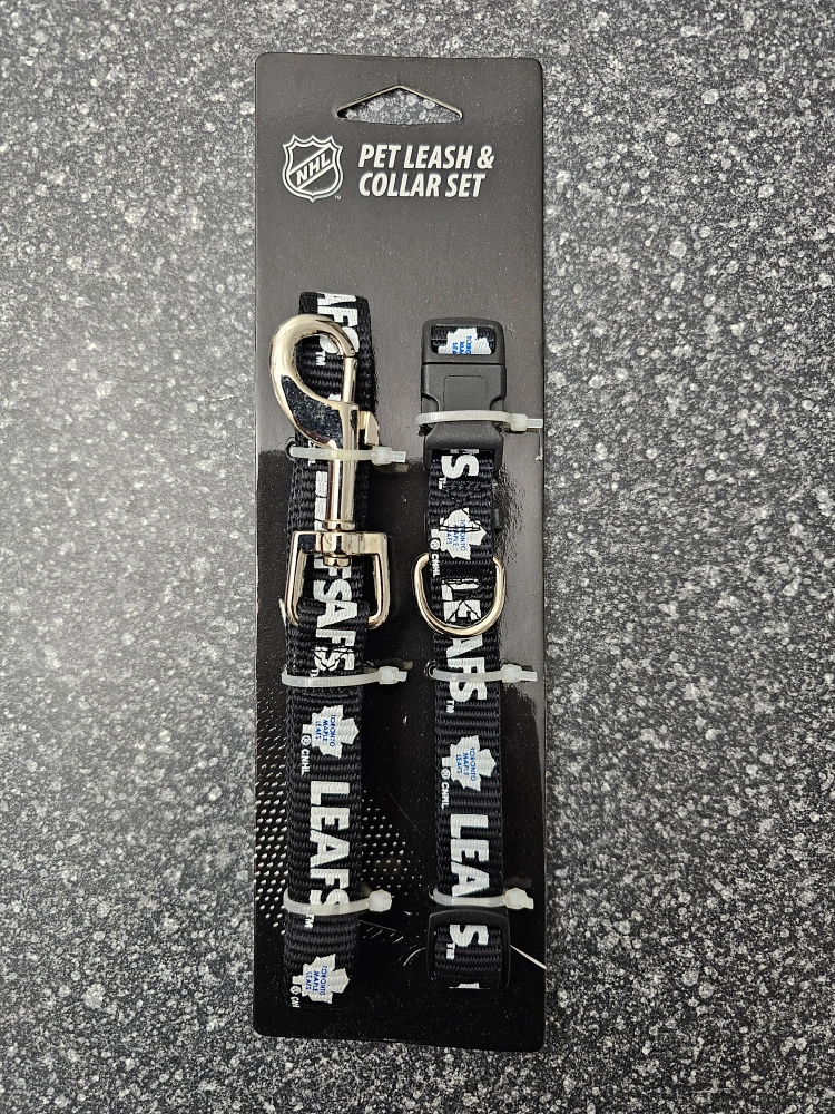 New pet leash and collar set. Black with white Maple Leafs logo. Leash 5' long. Collar adjustable from 12" to 18".