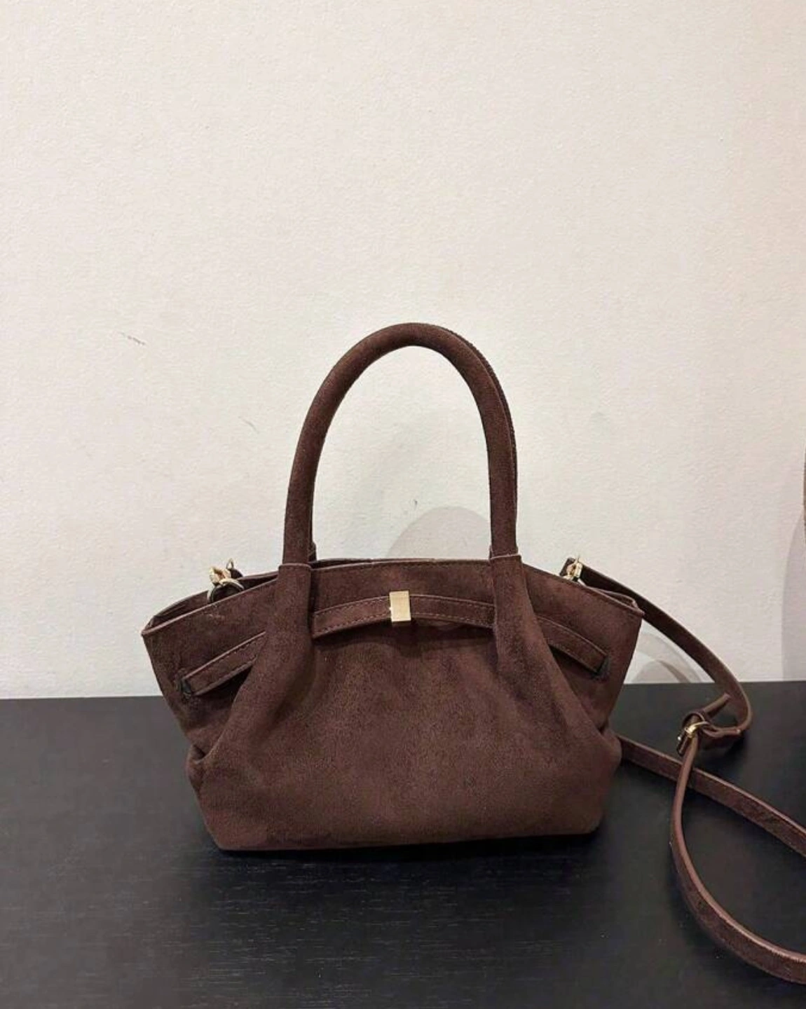 Small brown suede handbag. Features top handles and a detachable shoulder strap. Gold-toned hardware accents. new and unused