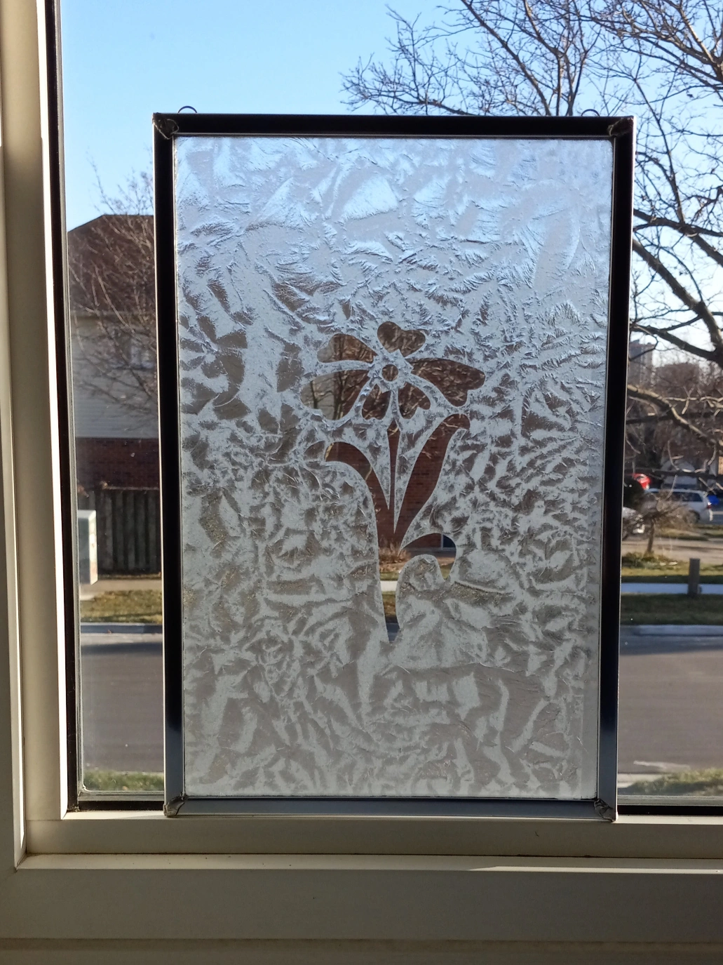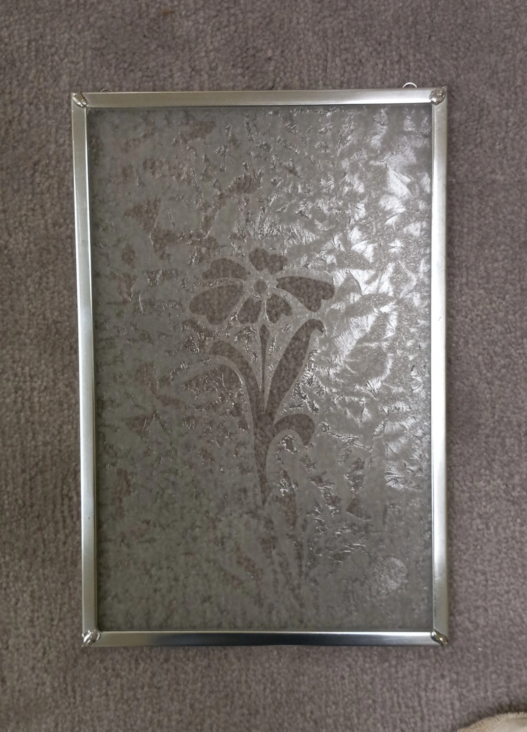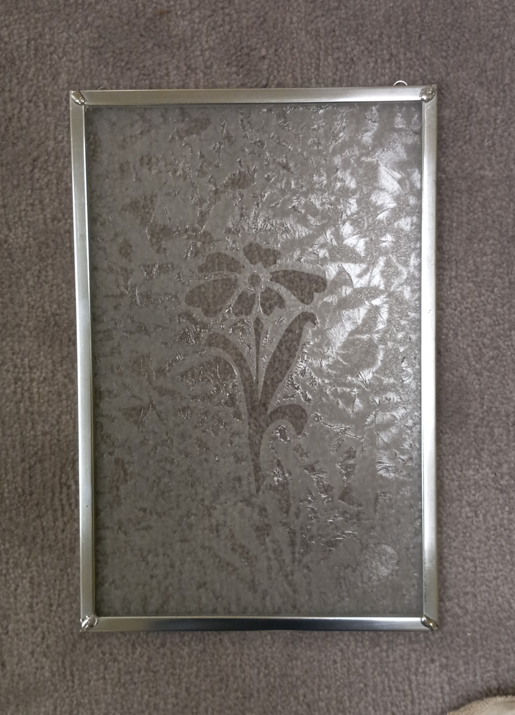 Reclaimed vintage glass panel. Etched glass with flower in centre, I added a zinc frame and rings for hanging, lovely touch for window.