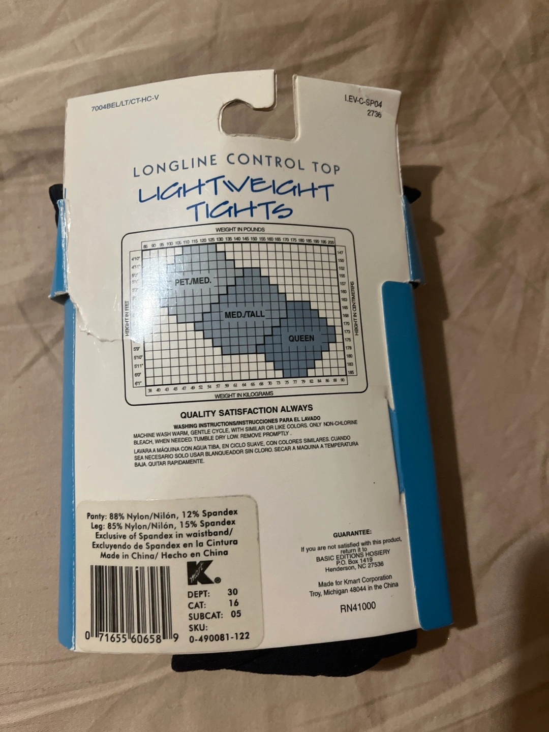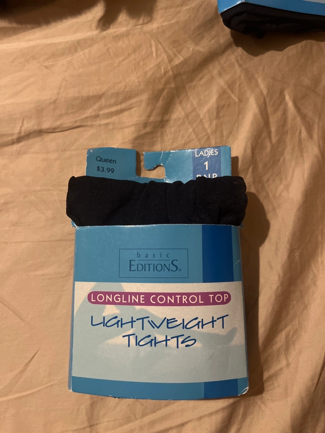 New, never worn tights. Queen size. Longline control top. Lightweight material. Black color. Made in China.