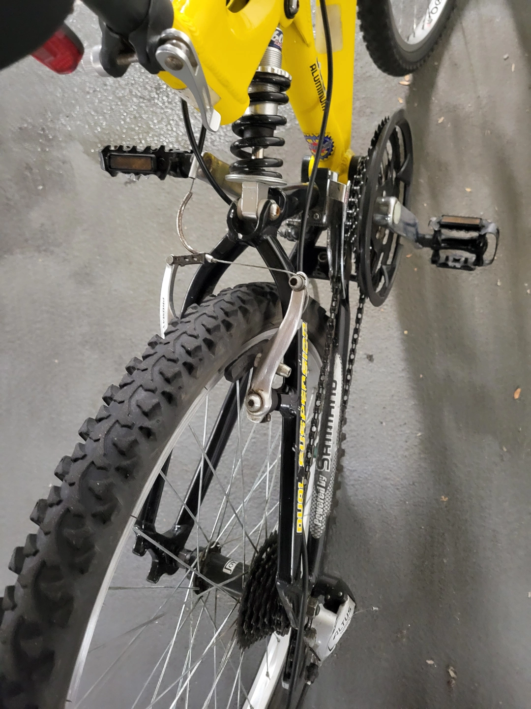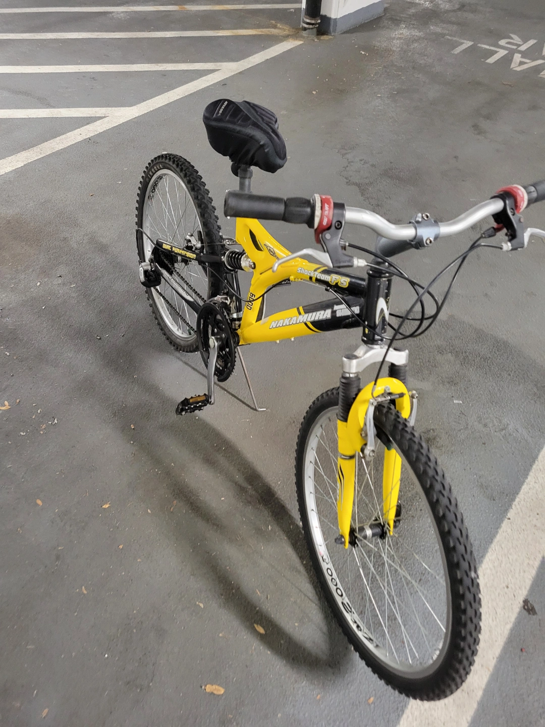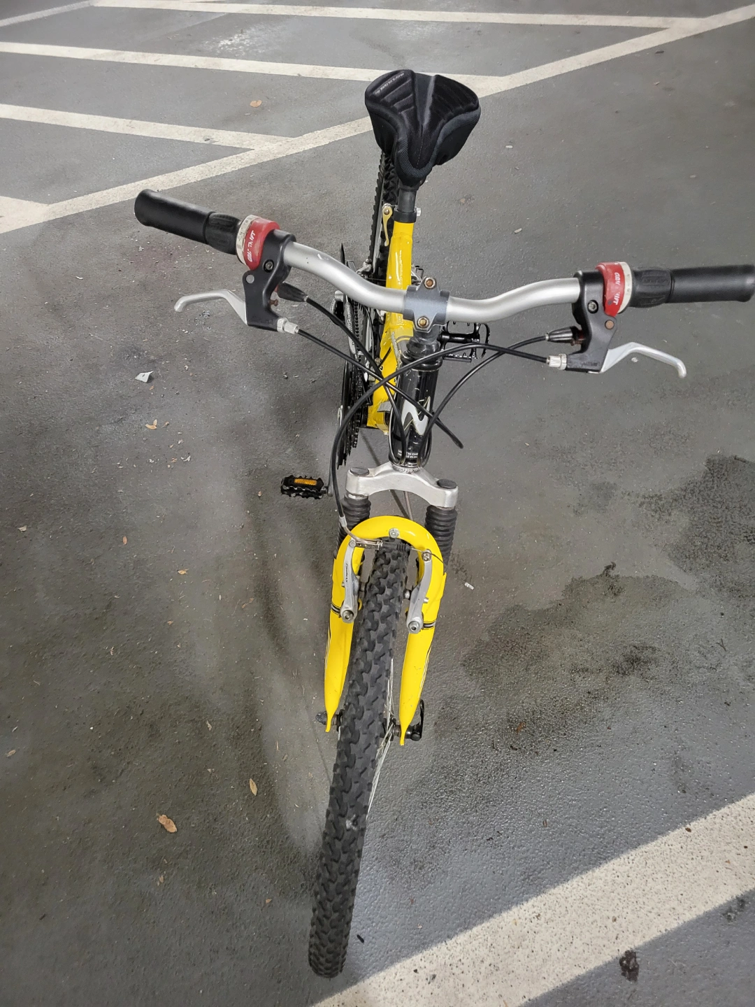 Yellow and black mountain bike. 24-inch wheels. 21 Speeds. Front suspension forks. Rear suspension. Good for 9 up/ Teenagers or smaller adults.