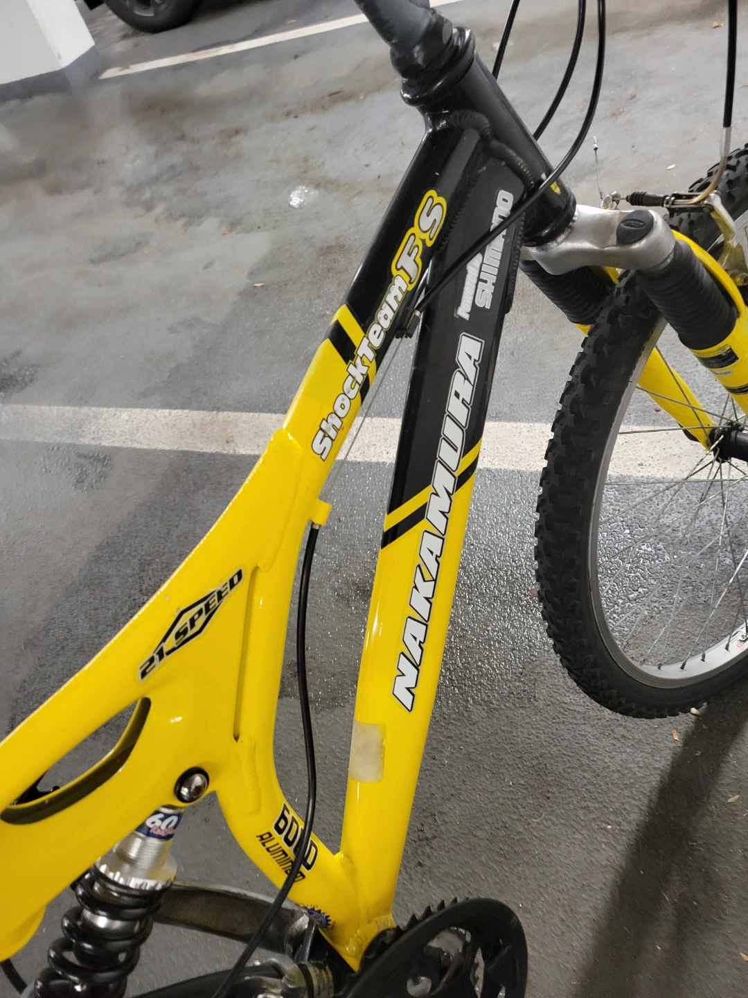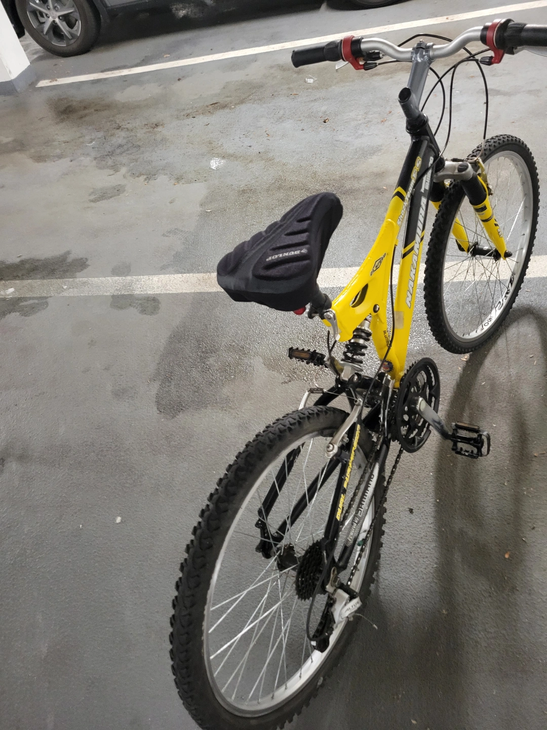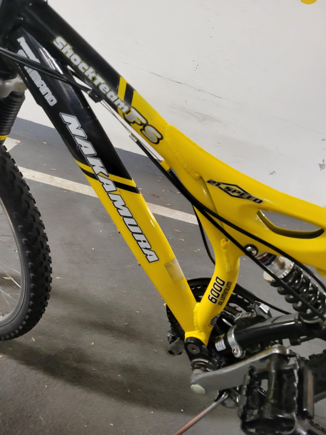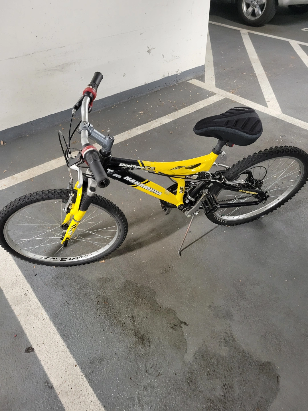 Yellow and black mountain bike. 24-inch wheels. 21 Speeds. Front suspension forks. Rear suspension. Good for 9 up/ Teenagers or smaller adults.