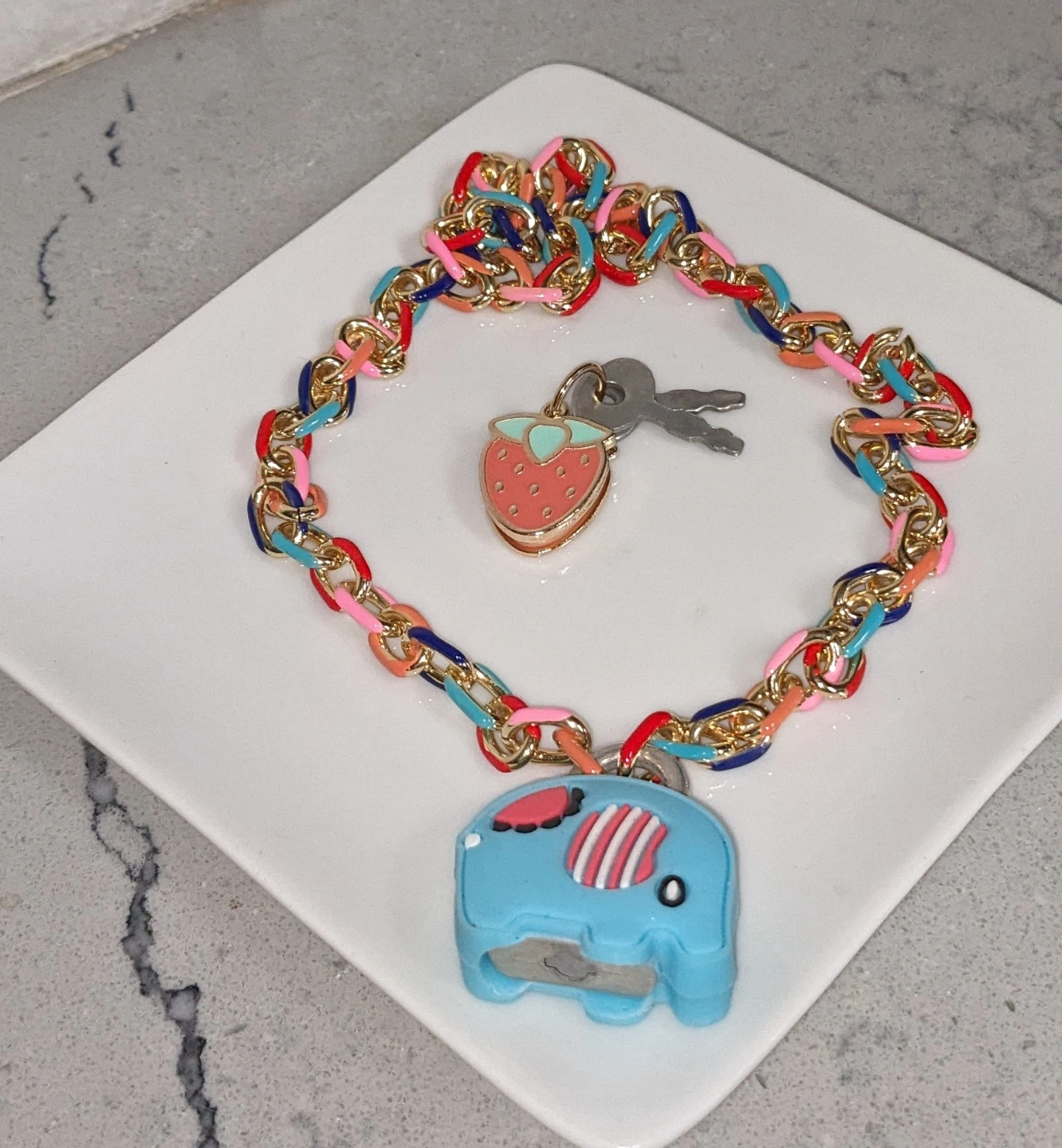 NEW. Cute necklace featuring a colourful enamel chain. Elephant lock pendant with a strawberry charm key chain.
