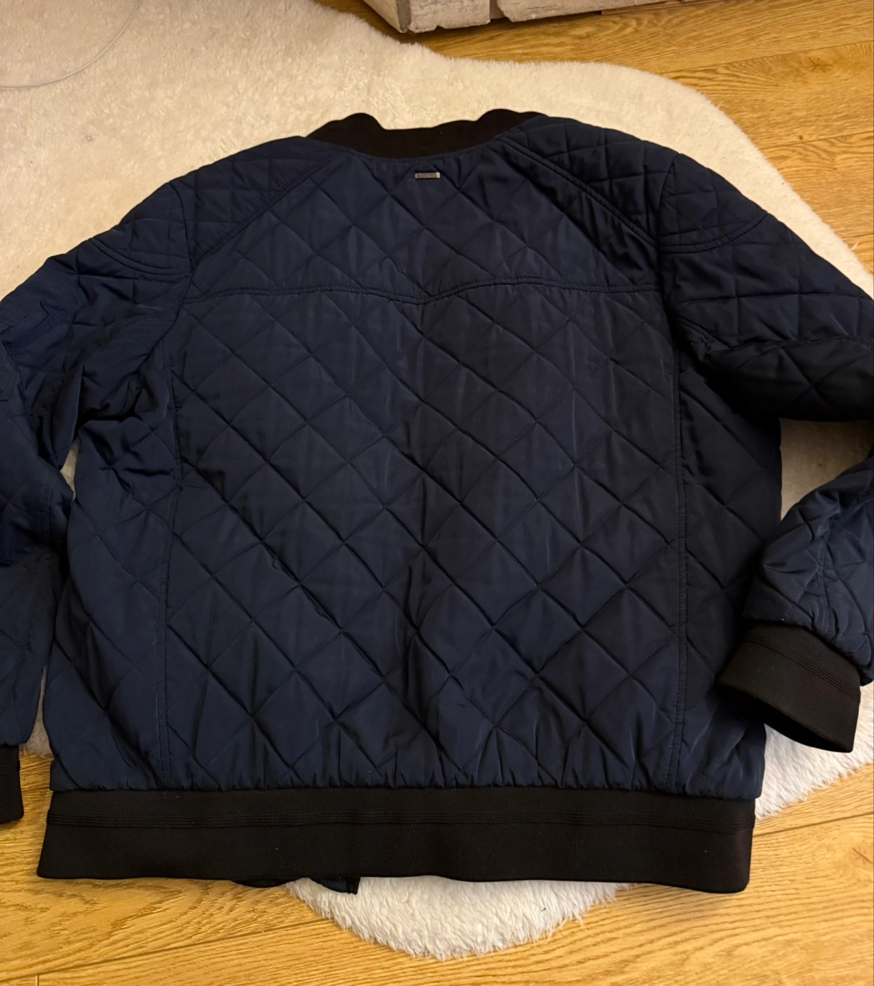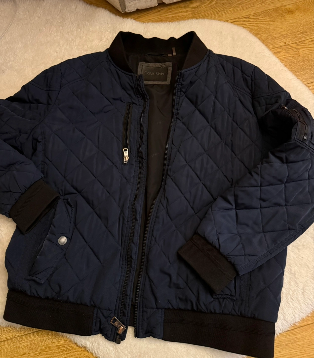 Navy blue quilted bomber jacket. Features a zipper closure, ribbed cuffs and hem. Two zippered pockets. Great for layering. Gently used. Size large.